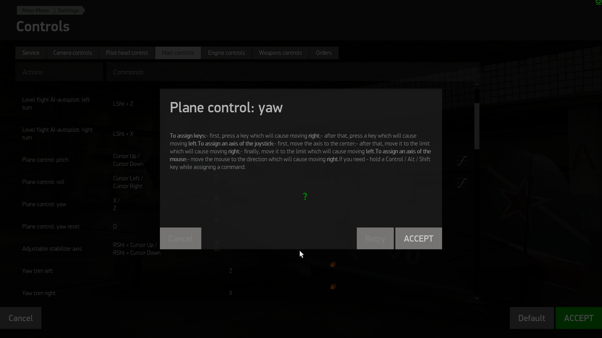 Sokol1 Posted May 14, 2018 Posted May 14, 2018 (edited) 1st - Assure that pedals are working OK for Windows - pre-condition for work in games. Click in Windows Start and type joy.cpl in the box, hit ENTER. In the Game Controllers window, select the pedal, click properties and test axes. If are OK for Windows, in the game try assign in this way: Move the rudder bar for for right and hold in this position, now click in the assignment for YAW, when the window open release the pedal. If don't work try the same again, this time press and hold for left side. If don't work, try renaming the folder "Input" folder in game folder data - this will erase all your assignment, but force the detection of controllers - joy, pedal... again. Edited May 14, 2018 by Sokol1