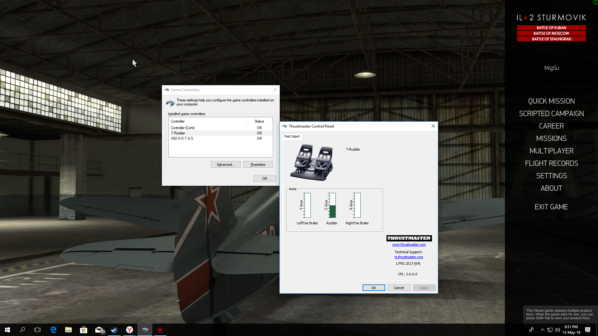 MigSu Posted May 14, 2018 Author Posted May 14, 2018 8 minutes ago, Sokol1 said: 1st - Assure that pedals are working OK for Windows - pre-contition for wokr in games. Click in Windows Start and type joy.cpl in the box, hit ENTER. In the Game Controllers windows, select the pedal, click properties and test. If are OK for Windows, in game try assign in this way. Move the rudder bar for for right and hold in this position, now click in the assignment for YAW, when the window open release the pedal. If don't work try the same again, this time press and hold for left side. If don't work, try renaming the folder "Input" folder in game folder data - this will erase all your assignment, but force the detection of controllers - joy, pedal... again. Did not work, so i'll try - If don't work, try renaming the folder "Input" folder in game folder data - this will erase all your assignment, but force the detection of controllers - joy, pedal... again.