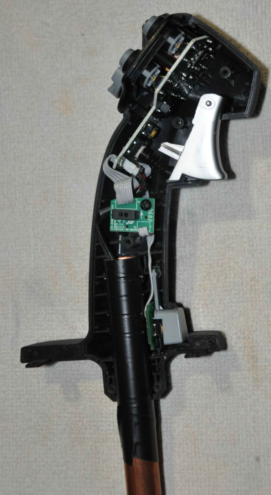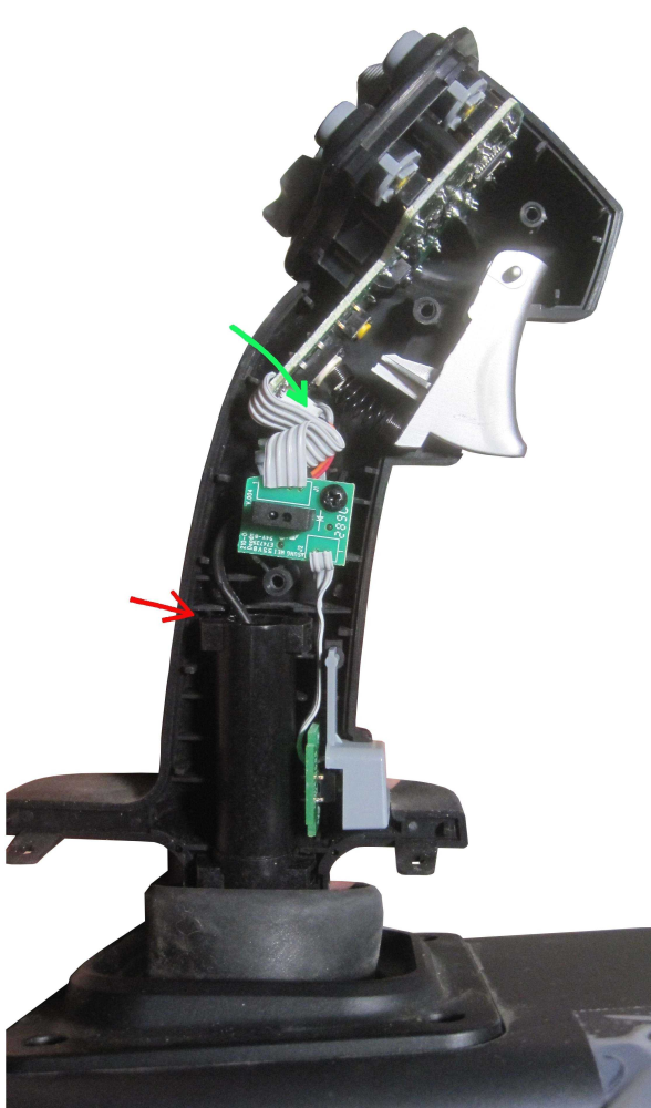 Wizzzard Posted January 22, 2014 Posted January 22, 2014 (edited) Thanks for asking. When I was doing the mod I kept thinking that I should do this kind of post in case someone else wanted to try it. You motivated me to actually do it. So... How I Extended the Handle of a Logitech G940 Joystick.I tried to make the mod reversible so there is no cutting or soldering involved. It has been about 2 years since I did this mod so I am a little fuzzy on some of the details. If something doesn't work as described that is why. Photo 1 - The handle with the 5 screws removed, the bottom hooks released and the right half removed. The red arrow points to where the top of the 1/2" i.d. copper pipe goes in the handle. The bottom of the pipe will rest on the top of the shaft and the top couple of inches of the tube will take the place of the shaft inside the handle.The green arrow points to the connector that will have a "jumper cable" added to the plug. These are only wires that run through the handle into the body of the joystick, so they are the only wires that need to be extended. Photo 2 - A better view of the socket and plug with the little circuit boards moved out of the way. Photo 3 - The plug with the original wires. I think that I had to lift a tab to pull out each of the wires. Photo 4 - One of the 2 pairs of wires that I found to make my jumper cable. These connectors slipped out of their socket after prying up the tabs. I stuck one of these on the ends of each of the original wires and wrapped the connections with electrical tape then the other end went back into the corresponding hole in the white plug. There should be lots of alternate ways to extend the wires. Photo 5 - The extension in place. The plastic tape wrapped around the end of the pipe is indented with the impression of the other half of the handle. That compression of the tape holds tightly enough that I didn't have to try to reproduce the tabs found on the original shaft. Photo 6 - This is the clamp that I made to attach the extension pipe to the shaft of the joystick. It is an old piece of 1 X 2 that I cut in half, screwed the pieces together and drilled a hole down the center of the joint that is the same diameter as the shaft and pipe. Photo 7 - This is the inside face of the clamp. I used a chisel and utility knife to cut the notches for the tabs on the shaft into both halves. The tape gives the pipe enough friction to keep it from sliding or twisting in the clamp, but I can twist it a little to line up the handle with the base. Photo 8 - The whole thing assembled, mounted on a kitty litter bucket that is cut down to bring the handle to the most comfortable height for me and bungeed to the side of my chair for stability. It is not pretty, but it works quite well. The extension made an immediate improvement in my shooting. I feel like I have much finer control with it. It started as an 8" extension then increased to 12" just by changing the pipe. Fortunately, I started out with extra long wire just in case.I keep the Force Feedback on full. I can definitely feel it but it doesn't seem to throw off my aim like I thought it did before the mod. Edited January 22, 2014 by Wizzzard 2