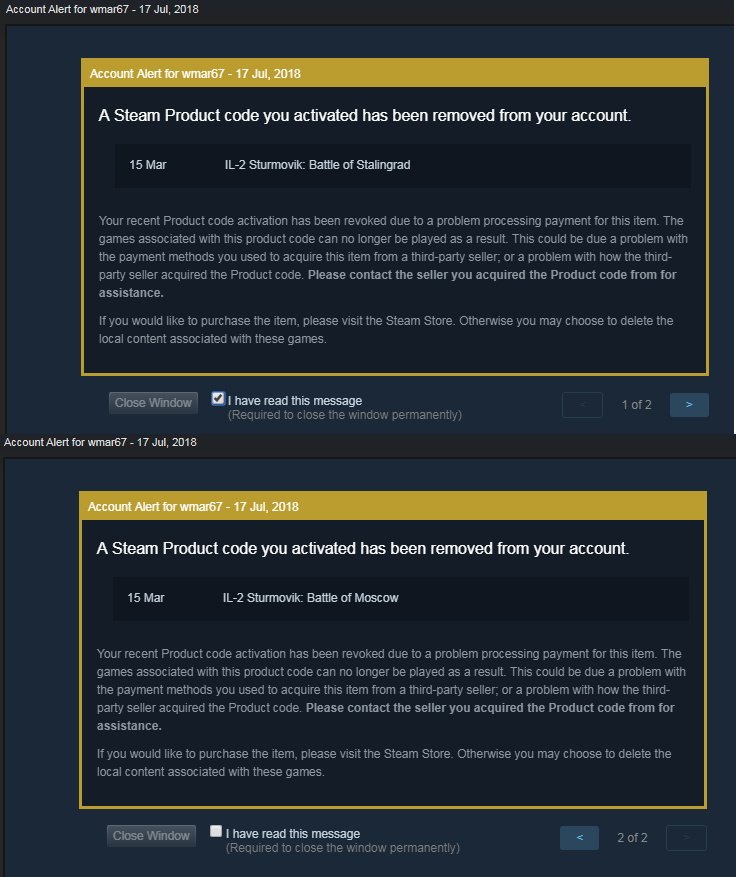 JudgeDredd Posted July 17, 2018 Posted July 17, 2018 Hi all I don't play very often, so I'm confused when I fired this up for the first time in ages to find that Steam has removed a product code I activated "due to a problem processing payment for this item". I have two identical messages, one for BoM and one for BoS. I don't recall getting any message about linking accounts, which I have apparently missed. Anyway. Any chance I can get the games back I paid for please? When I load the game in Steam, it says they're revoked - so no message to link accounts. Thanks