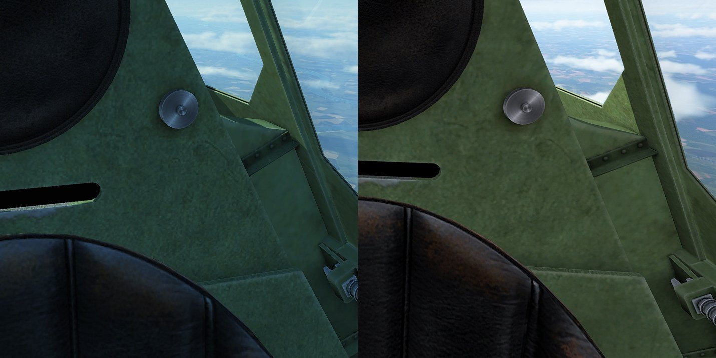 screamingdemon Posted May 29, 2020 Posted May 29, 2020 (edited) Hi Oyster...When I give it some thought I think like this: a) The main reason why this part is unpleasant on the eye when seated in the cockpit is because we can see it! Crazy right? In real situation pilot would scarcely see this structure when he turns to check 6, but in game we are facing it directly! So here we need the correction of pilot head/eye movement to look past this feature when in-cockpit view, which is beyond this mod scope (D-C-S does this well if you need example). b) Now to deal with this issue at hand, my impression when looking at this plate is that it is a low resolution piece. I believe that is due to the paint texture (the scrapes with no paint looks fine). And also the contrast between those machined nuts further creates the sense of a low resolution plate. I would propose to experiment by using (1) less "shadow" for the paint - more flat green (2) change the texture to be similar to the rippled one used on the metal part of gun site (and if that works apply it to all the stuff visible behind the seat too) Edited May 29, 2020 by screamingdemon