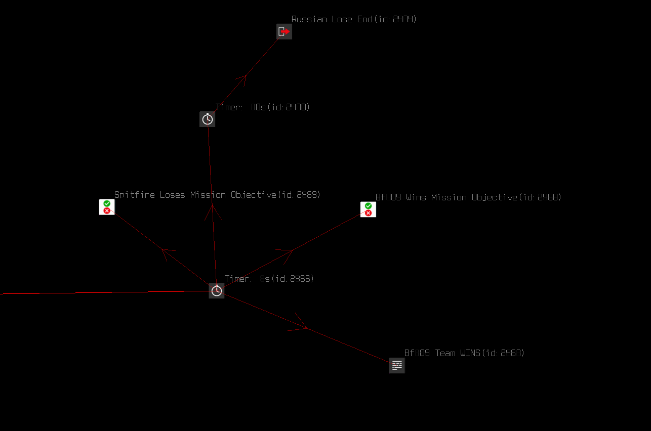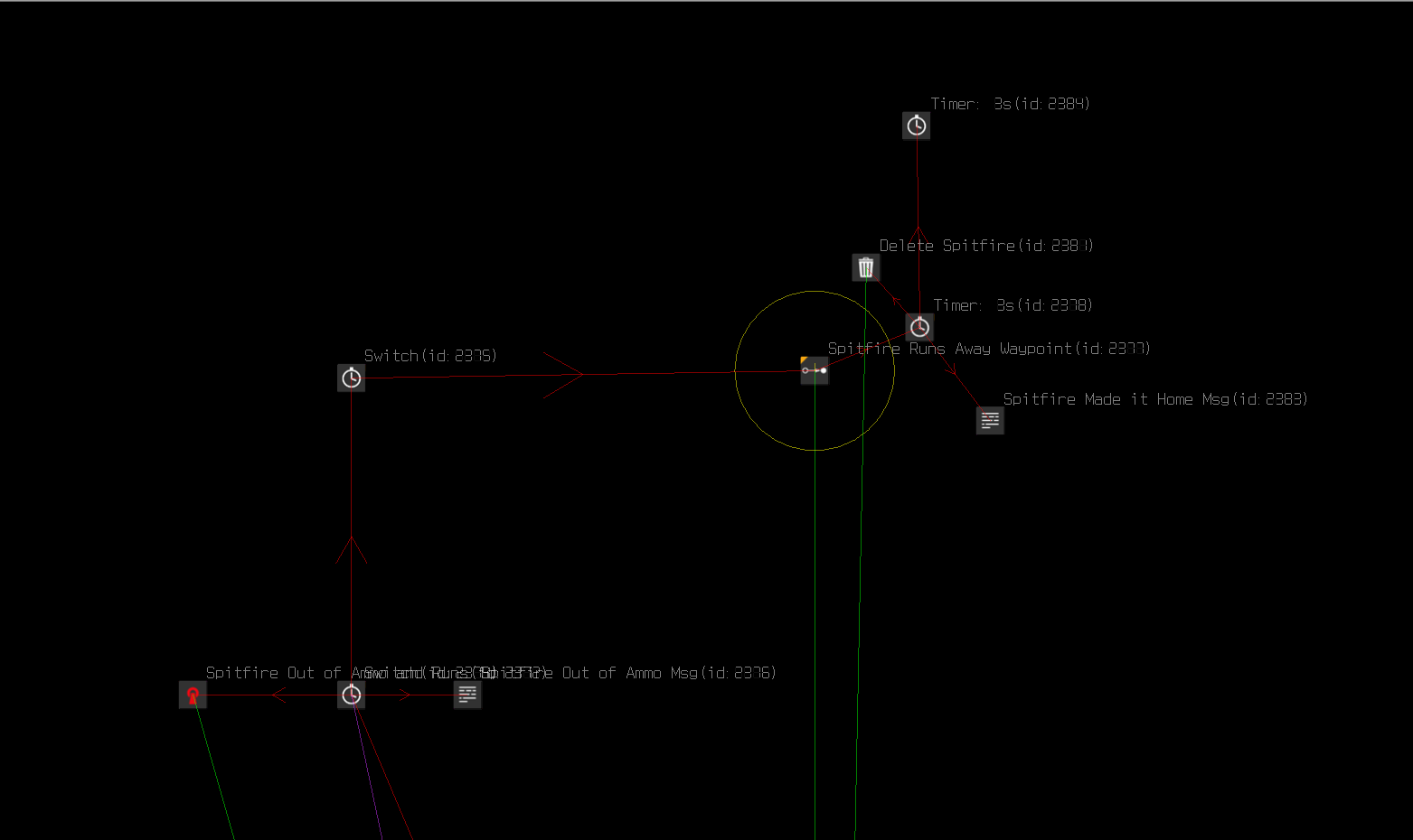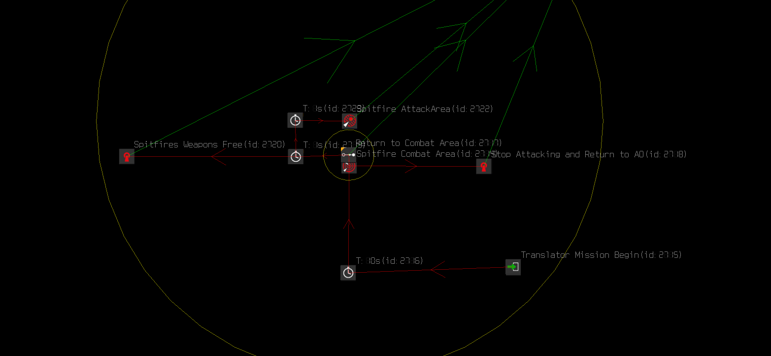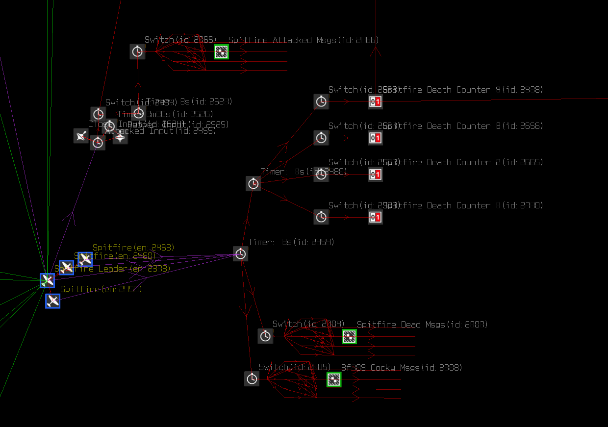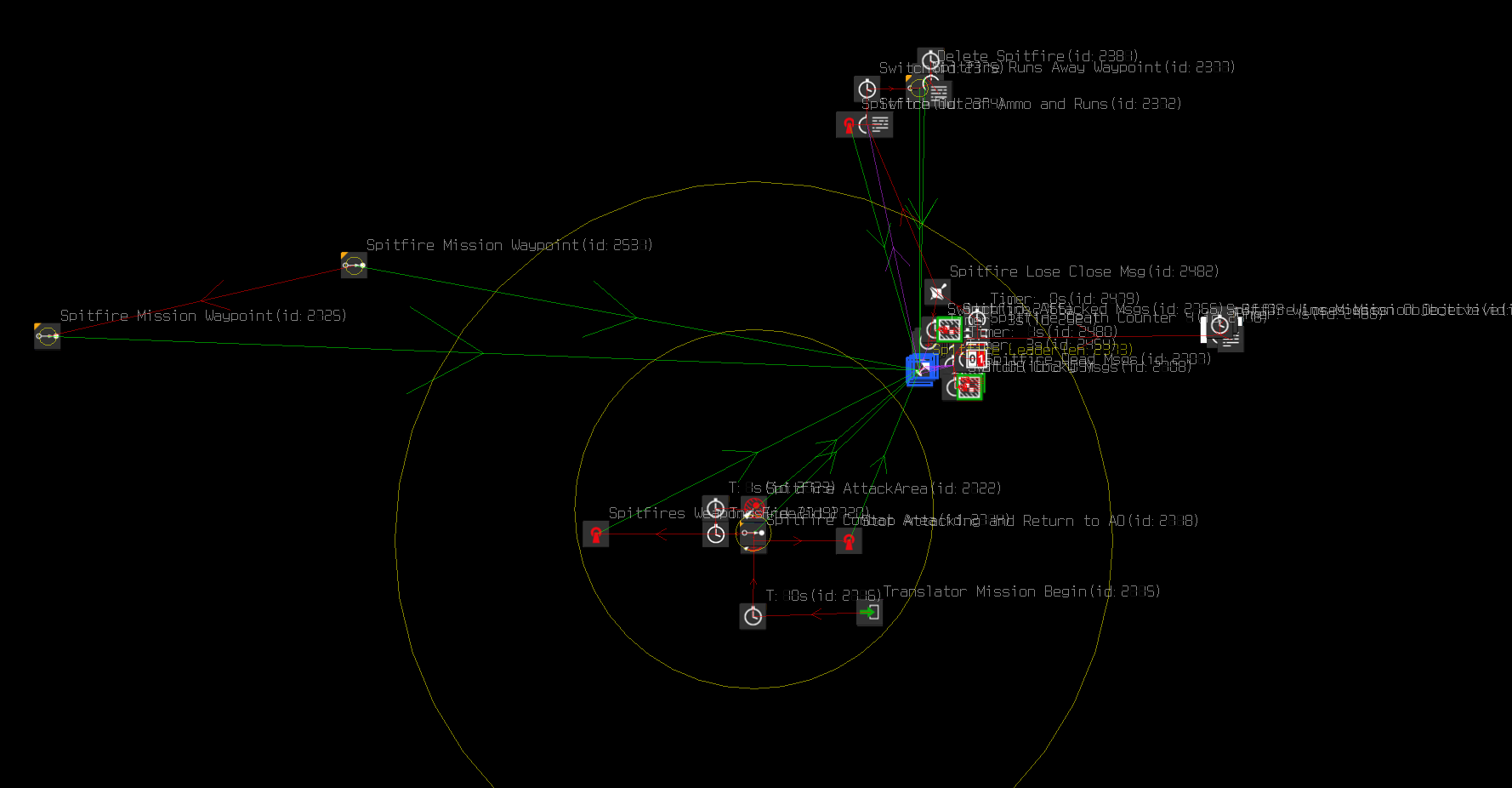 Sketch Posted August 4, 2018 Posted August 4, 2018 First image: Above the spitfire group is my OnAttacked -> If spitfires get attacked, they give a random message to the player every 3 minutes and 30 seconds. (As to not overload the player with "Oh noes, I'm being attacked!" every 5 seconds) To the right of the spitfires is my OnKilled section -> If a spitfire gets shot, the 109's give a random cocky message and a spitfire gives a random "I've been shot down!" message. Additionally, the counters count out how many kills have occurred. Right now I only have the fourth counter connected to my end the mission logic Second Image: My end the game logic. Pretty self explanatory. Third Image: This is my outOfAmmo logic. It gets turned off if all four spits are destroyed (obviously). However, you can turn it off earlier if you want. Just connect it to the appropriate counter. You can also give more waypoints, and/or landing logic. I only made a single waypoint for demo purposes. Fourth Image: This is my "Stay in the Combat Area" logic. Same as @SYN_Vander suggested. The spits will return to the center waypoint if they exit the checkzone. Only bad thing about this is the spits will do everything in their power to return to the center point before fighting back. To fix this, remove the forceCompletes and lower the requirement for the waypoint. The spits may not behave the way you want if you make those changes though. Fifth Image: All of the logic combined. Here is the group file to play with. Let me know if you need anything else. AiSpitfireGroup.zip