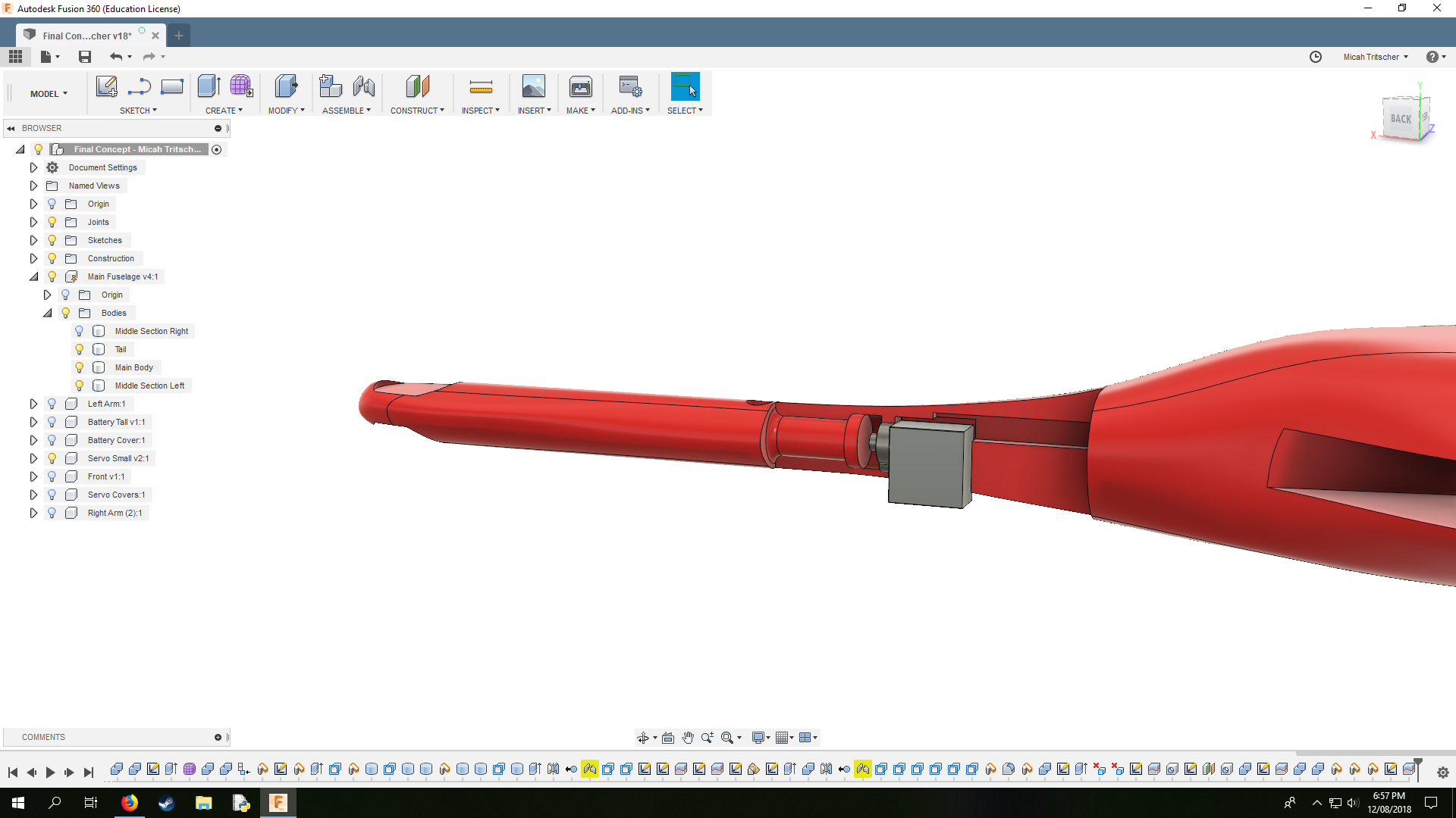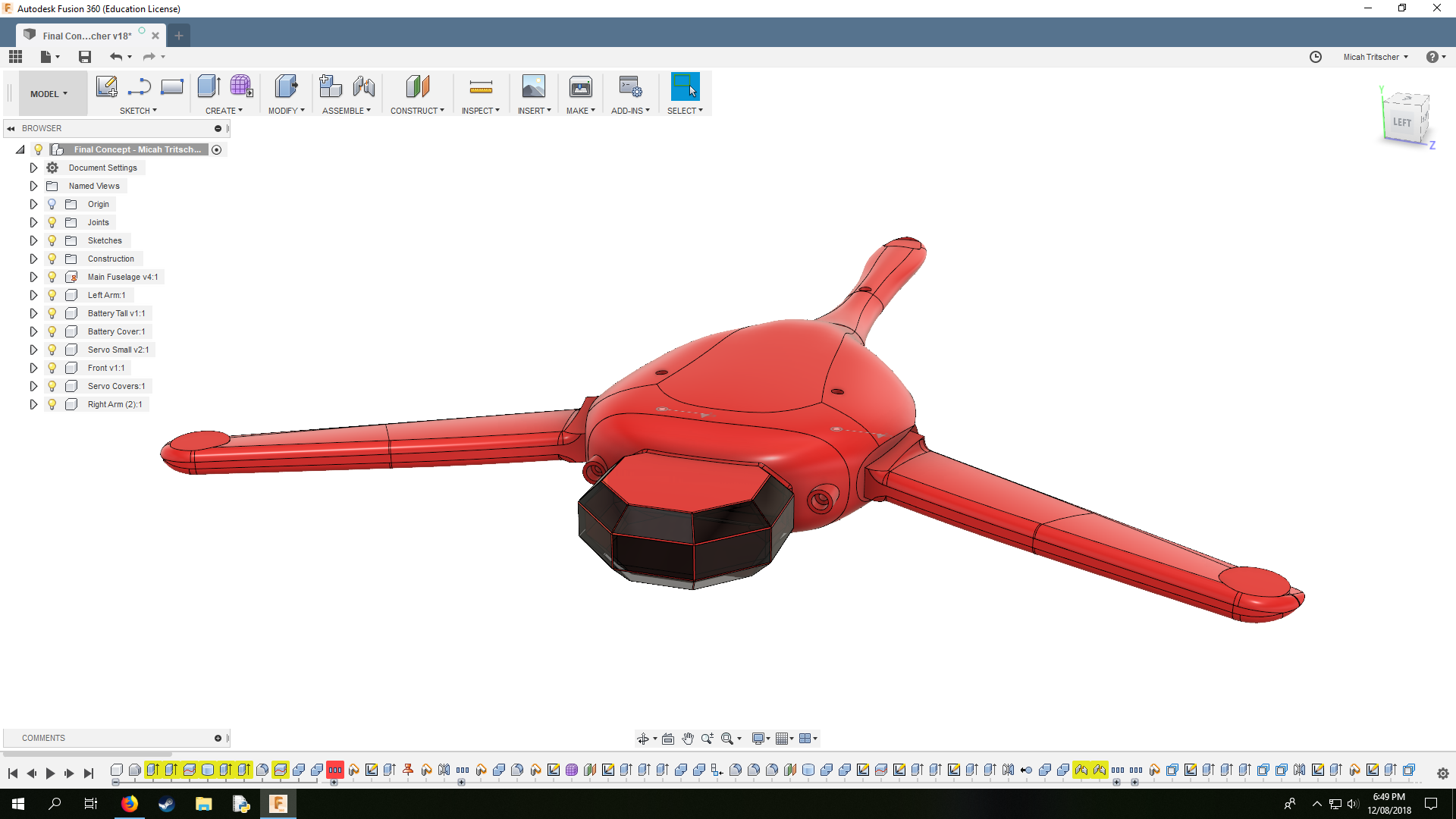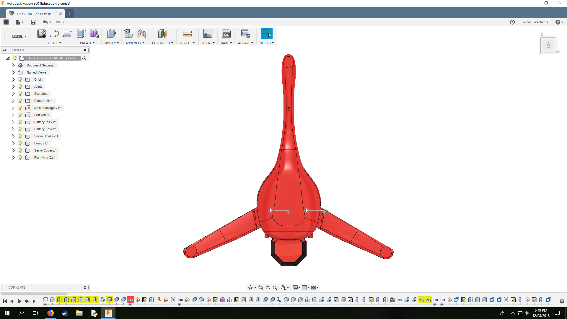 Stumble Posted August 12, 2018 Posted August 12, 2018 Hey Chaps, I'm currently in the process of making a drone as a project for school. I've decided on making a tricopter as it has multiple advantages over a quadcopter and its cool to make something a bit less popular. I believe it will help me learn more which I'm always up to. However, theres less info online for DIY tricopters so that's why i'm coming here to see if any of you guys have experience with this kind of stuff. I'm making the main parts by using a 3d printer to print out my body in plastic. I modeled it in Autodesks Fusion 360 (Which I'm new with). The model should be done printing by Monday when I get back to school so if it worked, I'll try take some pics and show you all. Here are some pictures of the models: It probably has a lot of flaws, and I probably didn't make it the best but all good. I'm learning. I made it so that the wings can fold in when not in use. Otherwise it will be way to big to carry around anywhere. From the front of the little "Electronics Box" to the end of the tail is about 500mm. The arms/wings are laid out 120 degrees to each other. The slot in the bottom can fit two of the battery's that I'm using (I think 2400mah 14.7V) and I have cut holes all around to help with all the wiring that connects to my Arduino Nano which I'm going to use. The little servo at the back controls the twist of the tail to counter the torque generated by the spinning motors. I have a few questions about that. First off, how much twist is required? I think I read somewhere that the yaw mechanism needs to be able to twist about 45 degrees or something like that. Also, I've heard this term "Tail tune" and I haven't been able to find out what that means. This probably isn't the best place to post this all, but i just wanna check in case one of you know about all this. I might also inspire one of you guys to try something like this yourself. I've got a lot of coding to do, and I'm new to it all Wish me luck. Salute! Stumble. 1