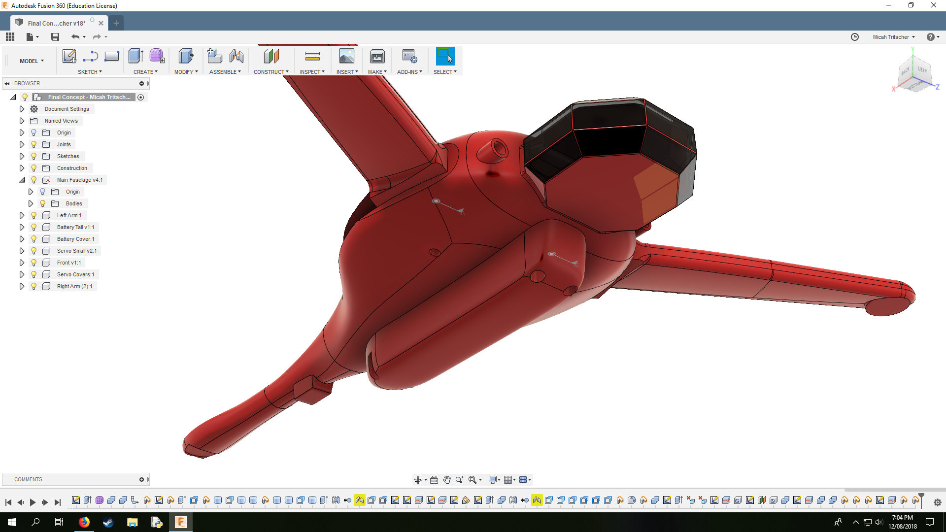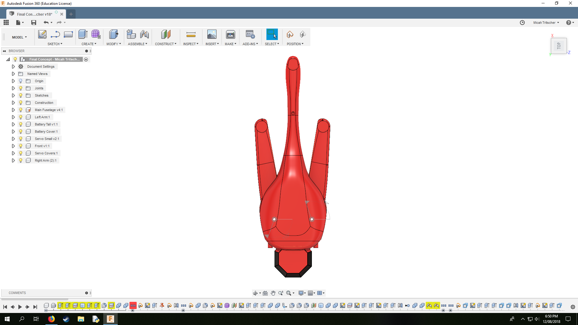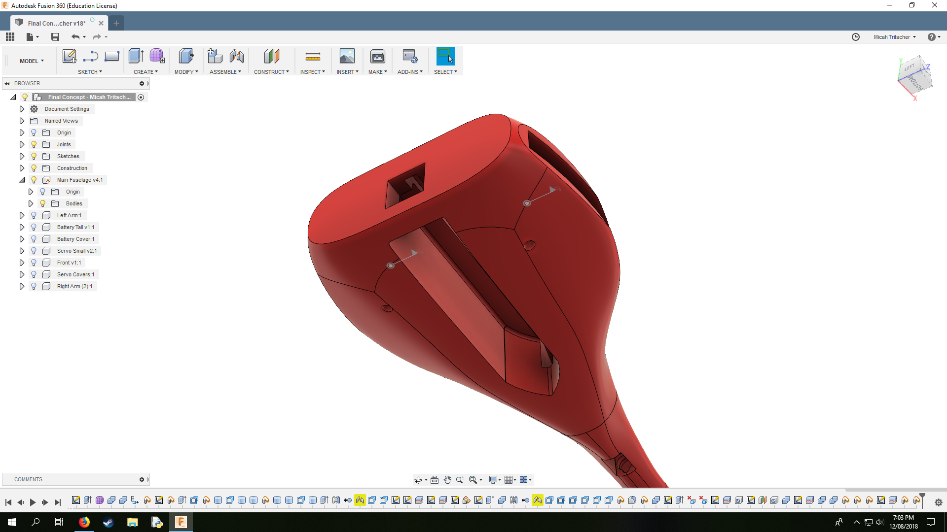 Stumble Posted August 12, 2018 Posted August 12, 2018 Hey Chaps, I'm currently in the process of making a drone as a project for school. I've decided on making a tricopter as it has multiple advantages over a quadcopter and its cool to make something a bit less popular. I believe it will help me learn more which I'm always up to. However, theres less info online for DIY tricopters so that's why i'm coming here to see if any of you guys have experience with this kind of stuff. I'm making the main parts by using a 3d printer to print out my body in plastic. I modeled it in Autodesks Fusion 360 (Which I'm new with). The model should be done printing by Monday when I get back to school so if it worked, I'll try take some pics and show you all. Here are some pictures of the models: It probably has a lot of flaws, and I probably didn't make it the best but all good. I'm learning. I made it so that the wings can fold in when not in use. Otherwise it will be way to big to carry around anywhere. From the front of the little "Electronics Box" to the end of the tail is about 500mm. The arms/wings are laid out 120 degrees to each other. The slot in the bottom can fit two of the battery's that I'm using (I think 2400mah 14.7V) and I have cut holes all around to help with all the wiring that connects to my Arduino Nano which I'm going to use. The little servo at the back controls the twist of the tail to counter the torque generated by the spinning motors. I have a few questions about that. First off, how much twist is required? I think I read somewhere that the yaw mechanism needs to be able to twist about 45 degrees or something like that. Also, I've heard this term "Tail tune" and I haven't been able to find out what that means. This probably isn't the best place to post this all, but i just wanna check in case one of you know about all this. I might also inspire one of you guys to try something like this yourself. I've got a lot of coding to do, and I'm new to it all Wish me luck. Salute! Stumble. 1