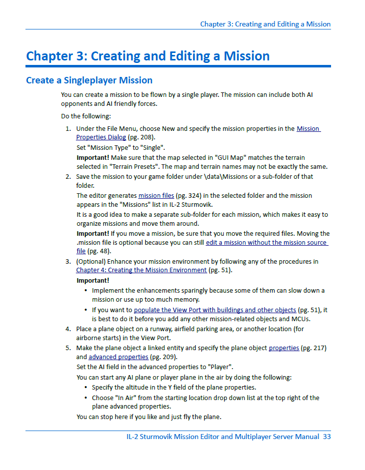 adler_1 Posted August 21, 2018 Author Posted August 21, 2018 2 hours ago, [TWB]Sketch said: Here's some links to help you out: This whole forum is chalked full of information -> https://forum.il2sturmovik.com/forum/92-mission-making-and-mission-editor/ @Pb_Vapor made some amazing video tutorials on getting a mission together here -> https://forum.il2sturmovik.com/topic/33345-vapors-mission-editor-youtube-series/ Prangster has a good manual on how to build missions here -> https://forum.il2sturmovik.com/topic/17721-prangsters-il-2-bos-mission-building-guide/ @JimTM created an unofficial mission editor manual, with example groups here -> https://forum.il2sturmovik.com/topic/26303-il-2-sturmovik-mission-editor-and-multiplayer-server-manual/ You can see my thought process on creating a multiplayer training mission here -> https://forum.il2sturmovik.com/topic/38696-carnival-how-i-create-a-multiplayer-training-mission/ And as always, you're welcome to ask the community here questions and we'll do our best to help you out great !! thanks 2 hours ago, [TWB]Sketch said: Here's some links to help you out: This whole forum is chalked full of information -> https://forum.il2sturmovik.com/forum/92-mission-making-and-mission-editor/ @Pb_Vapor made some amazing video tutorials on getting a mission together here -> https://forum.il2sturmovik.com/topic/33345-vapors-mission-editor-youtube-series/ Prangster has a good manual on how to build missions here -> https://forum.il2sturmovik.com/topic/17721-prangsters-il-2-bos-mission-building-guide/ @JimTM created an unofficial mission editor manual, with example groups here -> https://forum.il2sturmovik.com/topic/26303-il-2-sturmovik-mission-editor-and-multiplayer-server-manual/ You can see my thought process on creating a multiplayer training mission here -> https://forum.il2sturmovik.com/topic/38696-carnival-how-i-create-a-multiplayer-training-mission/ And as always, you're welcome to ask the community here questions and we'll do our best to help you out unfortunately all the above are about multi[player while i am looking for single mission not online stuff .i want to take off and land and create my own missions like in IL2 and in the old days CFS2 but i cant find a thing on the subject . there is a manual link here dating to 2015 by Bearcat but its not available . i have watched the YOUTUBE videos but hey are all multiplayer and not one shows a take off .