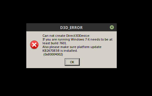 Nammi-namm Posted September 10, 2018 Posted September 10, 2018 (edited) I've tried it, this is the error window I get. Then it just crashes once you press OK. Hardware specs: Spoiler Computer Information: Manufacturer: Unknown Model: Unknown Form Factor: Desktop No Touch Input Detected Processor Information: CPU Vendor: GenuineIntel CPU Brand: Intel(R) Core(TM) i7-7700K CPU @ 4.20GHz CPU Family: 0x6 CPU Model: 0x9e CPU Stepping: 0x9 CPU Type: 0x0 Speed: 4500 Mhz 8 logical processors 4 physical processors HyperThreading: Supported FCMOV: Supported SSE2: Supported SSE3: Supported SSSE3: Supported SSE4a: Unsupported SSE41: Supported SSE42: Supported AES: Supported AVX: Supported CMPXCHG16B: Supported LAHF/SAHF: Supported PrefetchW: Unsupported Operating System Version: Linux Mint 19 Tara (64 bit) Kernel Name: Linux Kernel Version: 4.15.0-33-generic X Server Vendor: The X.Org Foundation X Server Release: 11906000 X Window Manager: Mutter (Muffin) Steam Runtime Version: steam-runtime-beta-release_2018-06-14 Video Card: Driver: NVIDIA Corporation GeForce GTX 980 Ti/PCIe/SSE2 Driver Version: 4.6.0 NVIDIA 396.54 OpenGL Version: 4.6 Desktop Color Depth: 24 bits per pixel Monitor Refresh Rate: 60 Hz VendorID: 0x10de DeviceID: 0x17c8 Revision Not Detected Number of Monitors: 1 Number of Logical Video Cards: 1 Primary Display Resolution: 1920 x 1080 Desktop Resolution: 1920 x 1080 Primary Display Size: 20.04" x 11.26" (22.95" diag) 50.9cm x 28.6cm (58.3cm diag) Primary Bus: PCI Express 16x Primary VRAM: 6144 MB Supported MSAA Modes: 2x 4x 8x 16x Sound card: Audio device: USB Mixer Memory: RAM: 16005 Mb Edited September 10, 2018 by [SIMS]Nammi-namm