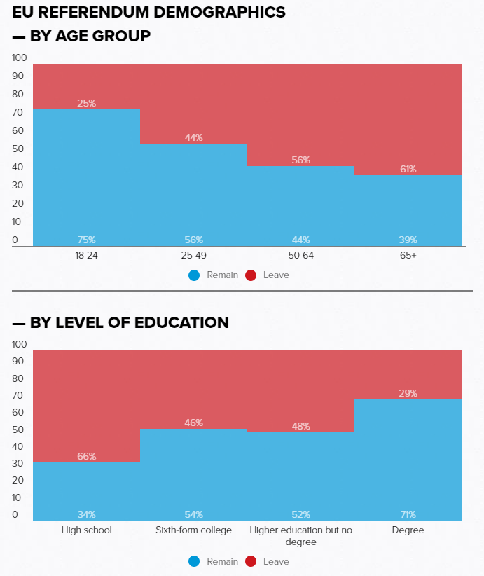 Leaf Posted August 25, 2018 Posted August 25, 2018 (edited) 23 minutes ago, rolikiraly said: Some of you have already mentioned your age, and it made me think about something I've seen a while ago. It was basically about the majority of the older generations voting for exit, and the opposite for younger people. Is it true, or just partly true or maybe total BS? (asking those from the UK or just anyone more knowledgeable than me). I'm not an expert on politics or economy (and I'm young, i have a lot to learn ) but i have a feeling that the EU is often just a distant, ugly scapegoat, that politicians of certain countries readily blame to cover the dirty sh*t they are doing themselves to their own country. Not saying that the EU is alright as it is. Also, while the progress is definitely there, compared to earlier periods, seven decades of peace and harmonious relations since 1945 in Europe are not entirely true. At least if you count Ukraine, Hungary or ex-Yugoslavia as Europe. Absolutely right, the statistical trends were very interesting. There was a degree of "scapegoating", especially in the recent, more austerity-affected years. 10 or 15 years ago barely anyone was complaining about the EU, or if they were, not many people were interested. But with more recent government policies resulting in greater income inequality, reduction in quantity and quality of public services etc., the EU became something to blame, especially given its more open views regarding migration. Source https://www.politico.eu/article/graphics-how-the-uk-voted-eu-referendum-brexit-demographics-age-education-party-london-final-results/ (based on YouGov exit poll) Edited August 25, 2018 by Leaf