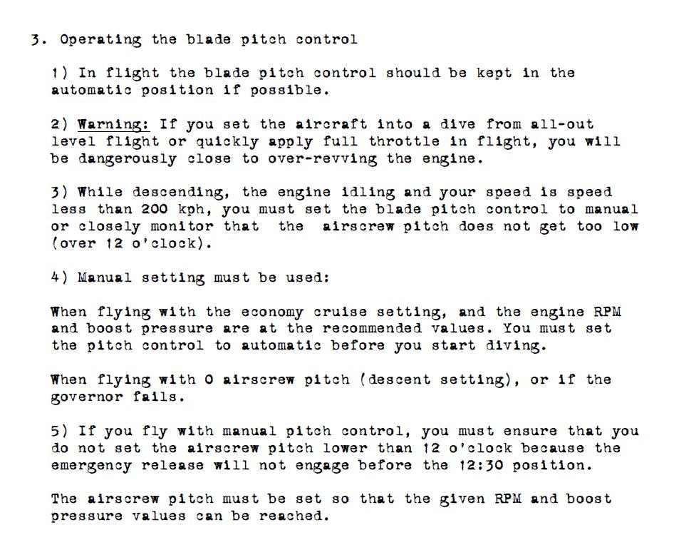 unreasonable Posted September 20, 2018 Posted September 20, 2018 (edited) 29 minutes ago, ZachariasX said: I knew for ground operation and takeoff you set it to manual and fully fine. You can - but the G-2 manual I have recommends automatic. The only time manual is required - provided the governor is working - is for an idling descent or to meet the ata and rpm requirements for economy cruise. On the former I find the wording a bit ambiguous,(see below) but I take it to mean that on an idle descent you should use manual to maintain fine pitch without it becoming too fine. Taxiing is easy on automatic with the rpm showing 1200-1300, no prop fiddling required. I generally fly the entire mission on automatic from take-off to turning the plane in the emplacement to face out before turning off the engine. Edited September 20, 2018 by unreasonable 1