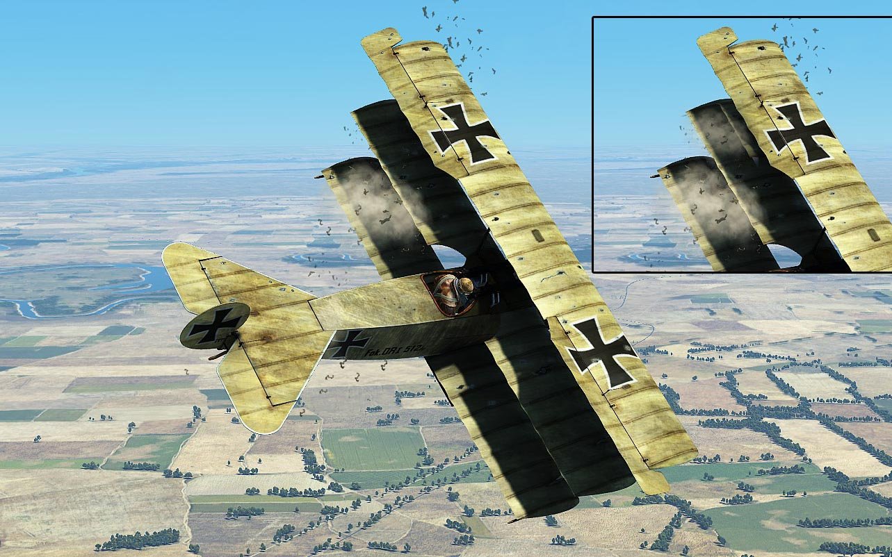 peregrine7 Posted September 26, 2018 Posted September 26, 2018 1 hour ago, Wolferl_1791 said: I'm talking about the new wood effects on the WW1 birds. The debris is great, but the puffs of dust are simply too big. And as they disperse, they get even bigger. Especially in VR, with all the effects at minimum (the pic below is with max settings), it's particularly noticeable. Edit: I've updated the pic. In the right corner you can see the original effect on the lower wing, but the exact same effect at 50% size and 60% opacity on the middle wing. IMHO it looks much more realistic for a single bullet hitting a wood/canvas wing. Way too opaque, but looks the right size to me. The wood chips look awesome. Way, way, way too opaque.