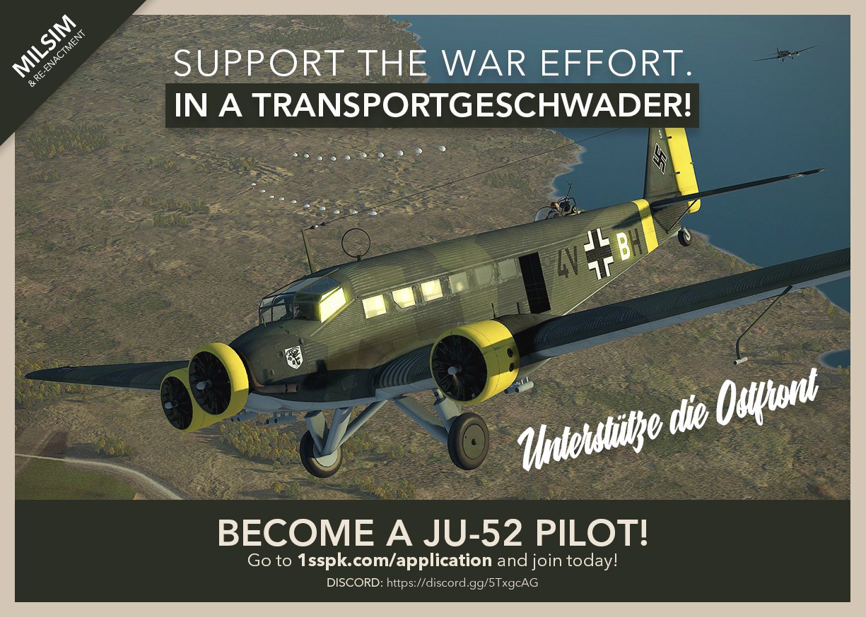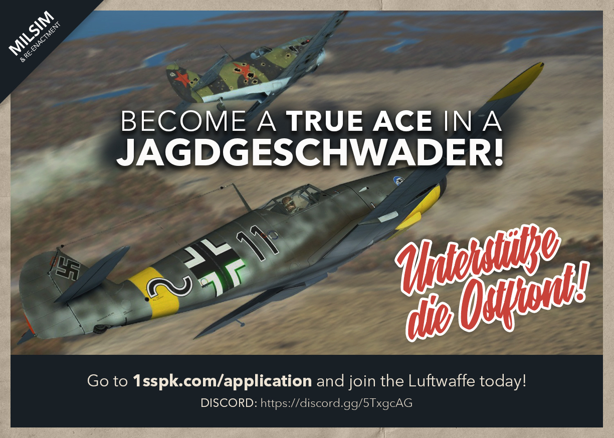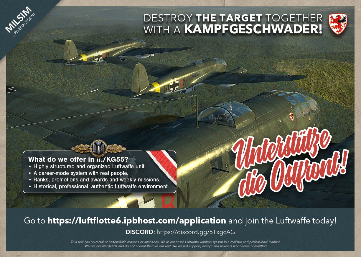 III./SG77-R_Lehmann Posted April 14, 2021 Author Posted April 14, 2021 (edited) Spoiler Discord Link: https://discord.gg/5TxgcAGApplication: Application form This unit has no racial or nationalistic reasons or intentions. We re-enact the Luftwaffe wartime system in a realistic and professional manner. We are not Neo-Nazis and do not accept them in our unit. We do not support, accept and re-enact war crimes committed. Edited April 14, 2021 by III./SG77-R_Lehmann