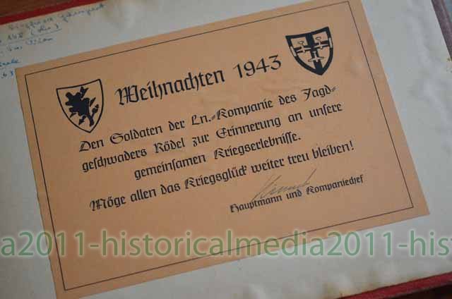 Bremspropeller Posted October 13, 2018 Posted October 13, 2018 (edited) Hi Spektre, I can give it a shot: Christmas 1943 To the soldiers of the Ln.-Kompanie* of Jagdgeschwader Rödel** in memory of our shared wartime experience. May the fortunes of war stay with everybody. signature Hauptmann and company commander ____ * Luftnachrichtenkompanie ** Units in the german military are often called by their commanding officers' names - e.g. "Kommando Nowotny" The name is fitting as Gustav Rödel at this time was Kommodore of JG 27, which is indicated by the coat of arms in the upper righthand corner. Edited October 13, 2018 by Bremspropeller