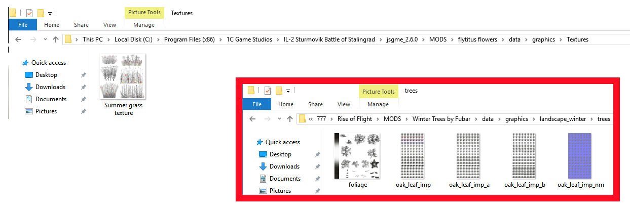 HappyHaddock Posted November 4, 2018 Posted November 4, 2018 (edited) Hi, I'm hoping some kind soul will help me out as I seem to be having somewhat of a "senior moment" where I am making a right mess of what should be a simple task. In Rise of Flight I used JSGME as a mod enabler for other people's mods and also wrote and shared my own mods. Now Flying circus has started to introduce WWI aircraft I've finally started taking an interest in this updated version of the sim and so thought I'd start by downloading a couple of the mods I'd seen listed on this forum. I've downloaded and installed JGSME, installed the mods I wanted into the "MODS" folder JSGME created, opened up JSGME to slide over the first mod I wanted to activate, turned on the in game "Mods ON" mode, opened up the sim and... there's no sign the mod has been implemented. I've checked all sorts of things from re-booting, have gone back through the whole process starting from scratch again, and then tried all this again with a different mod and still nothing. I'm puzzled and am left with a few possibilities as to why Flytitus flower mod doesn't work for me. 1)The file naming hierarchy for the mod may not be correct on my PC so may have a mis-spelling or mistake with upper/lower case naming of one/more of the sub folders, or have an entire folder in the hierarchy missing 2)The mod isn't applicable/compatible to the maps I'm using (Lapino summer and/or Stalingrad summer) 3)I note that a few years ago the MODS folder was created directly within the ROF directory, but that in IL2 (Flying Circus) JSGME created the MODS folder as a subdirectory within itself, but if I try moving the MODS folder up one level then JSGME doesn't actually find any mods at all, so I'm assuming it has created the MODS folder where it needs it. (see attached picture for comparison of file hierarchy) Does anybody have any thoughts as to what I may be doing wrong. Cheers Happyhaddock Edited November 4, 2018 by HappyHaddock