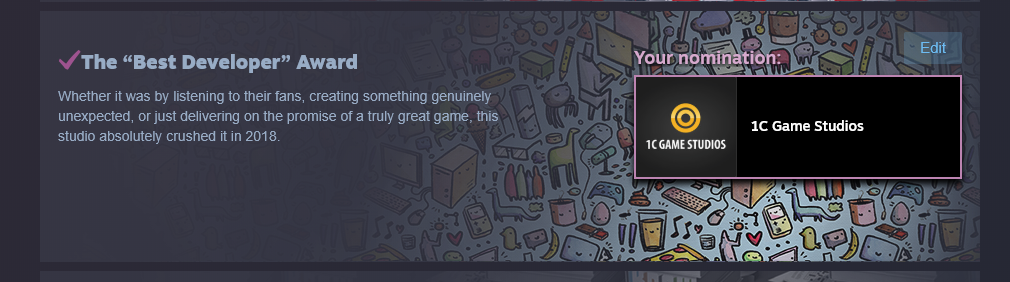 CAPSLOCK_ON Posted November 27, 2018 Posted November 27, 2018 Done, and also voted for the Labor of Love and Best Developer (1C Game Studios) awards too.