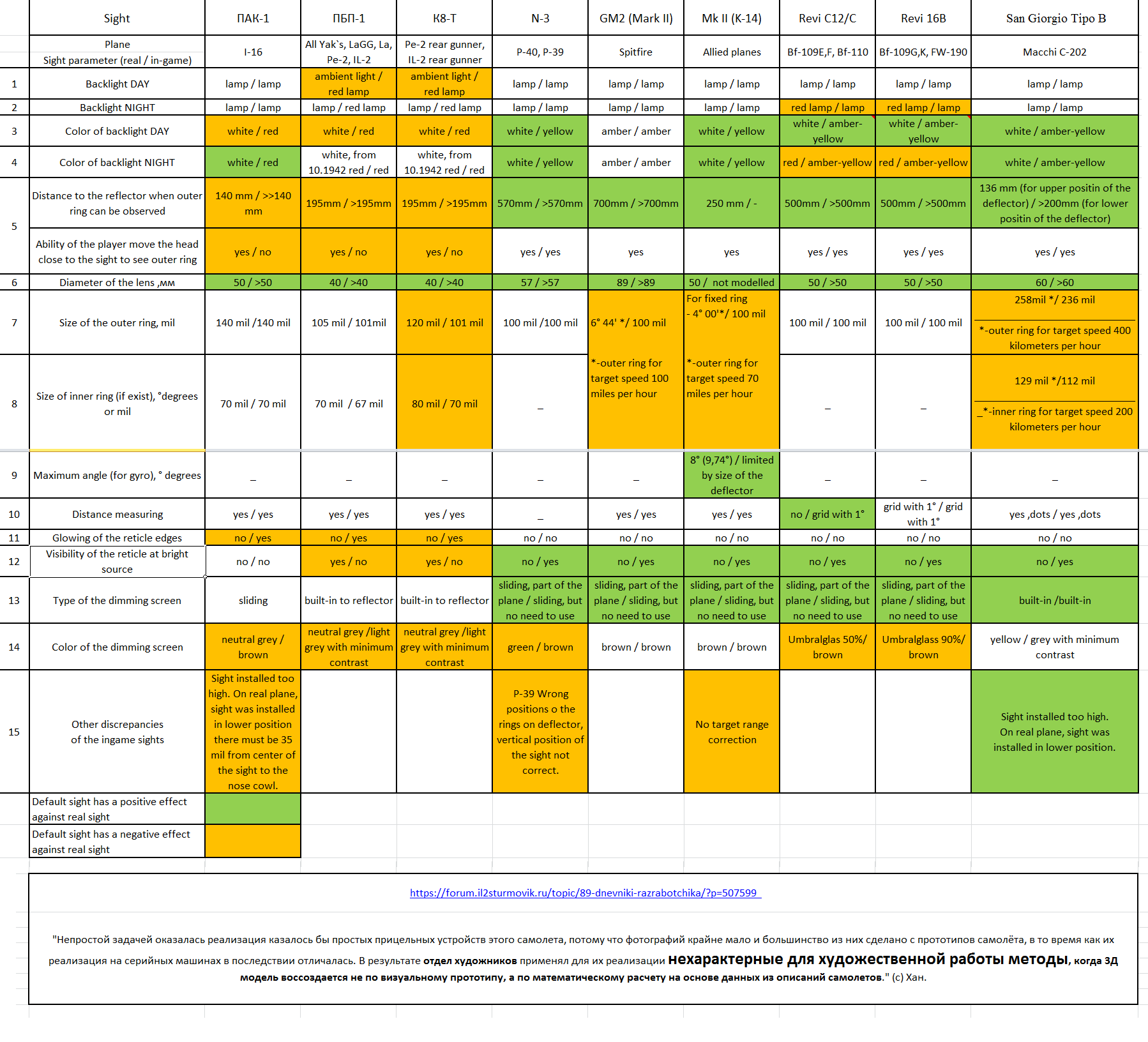 ROSS_BerryMORE Posted December 16, 2018 Posted December 16, 2018 (edited) Dear virtual pilots! Some guys collect info about sights and make mod for soviet sight PBP-1, which not correctly modeled. This mod contains next changes for in-game sight: 1. Geometrical parameters of the reticle (form and width of lines, amount of aberration (not sure if this correct definition for glowing edges of the reticle) – for this changes was used real sights in museum and manuals as reference. Like this: 2. Color of the reticle set as on real sight with ambient backlight. 3. Color of the dimming screen set as on original real sight. Let see which realization (default or mod) more close to the real sight. Let compare performance of the sights in the boundary condition of the backgroung lighting: against the sun, on bright background, at dusk or dark background and at night. First, we note two most important features of the sight PBP-1 (ПБП-1): 1. With ambient light, brightness ratio of the reticle to background is permanent: (there is translated text of the document) 1st box: Feature of the ПБП-1 is backlight of the reticle using ambient light. No need use lamp for backlight during the day. Underlaying: at the night using lamp with power 0.15 watt – this is less than 100 times than lamp in ПАК-1 sight. 2nd box: ambient backlight during the day provide clear visibility of the reticle in any attitude of the plane and any background condition. 3rd box: brightness ratio of the reticle to background is permanent. So the reticle is never disappear (as in ПАК-1). The brighter background gives the brighter reticle. And the reticle constantly visible on any background with ambient backlight. 2. Night red backlight of the sight is not visible at the day, cause lamp is not so powerfull - 0.15 Watt. There is some kind of calculations of lighting parameters. Let see how it must work in the game: https://youtu.be/7LZKR0NZNuw Slides: 1. 0:08 real sight. Compare to the in-game sight. 2. 0:53 Inconsistencies: 1. Ingame reticle disappear at bright background - must be visible on any 2. Color of the reticle - red. But it must be red only at night and only after october of 1942. 3. Reticle has glowing of the edges - real sight did not have it. 4. Dimming screen did not have the same color and contrast as real sight. 3. 1:46 Inconsistencies: white uneven backlight reticle. Minimization of intensity and lighting gradients of the reticle texture. Red text tells about that switch to night backlight can be done when turn on cabin backlight just using red colored texture. Minimum of backlight at night uses to prevent pilot blindness - at night sky any other source of light can not be spotted if backlight will be on maximum. 4. 2:00 Main feature of the PBP-1 is: Brightness ratio of the reticle to background is permanent. So the reticle is never disappear. The brighter background gives the brighter reticle. This mod shows that is can be implemented. Please realize it in the game. So, as you can see, modded sight is closer to original sight than in-game version. And keep in mind that in-game REVI sight uses during night – backlight for the DAY, not as used for the night… Spoiler … with the red filter, as it was in the real sight. Reticle did not disappear when you look against sun – so using of the dimming screen as in real life is not necessary anymore: Spoiler Bright background: Spoiler .., the limitations of the modded sight PBP-1 is not worse than limitations of the in-game REVI sight. In a real sight, a lens with a mask of the reticle, like a camera lens, looks at a target. And the pilot also looks at the target, only through a slightly darkened reflector. The image of the reticle is the difference in the brightness of the image of the target that has passed through the reflector filter and the brightness of the image of the target, bypassing the reflector. This differences of the brightness of the images always the same. At the day and at the night. In the shadows and in the clouds. Usage of the lamp constantly is not allowed by the manuals and most important cause – night backlight simply can't be seen during day. So, using red backlight for a sight during the day not correct. This mod just for check how sight can be modeled much close to the real sight. No need special ray tracing technology for that. But developers need to make some corrections: 1) Make uneven reticle mask for “DAY” with sharp-edges. 2) Make two color of the reticle – for DAY and for NIGHT, which can be chosen as unlock, or selected automatically if there night time of the mission, or turning on cabin/instruments lighting. For the “night reticle” is just need to replace color of the reticle texture from white to red. Anyway, everybody can download this mod and test it. This material I`m copied from russian forum, hope developers take a time and make some corrections to the game sights. In attachment you can find table with information about sights parameters. Edited December 16, 2018 by ROSS_BerryMORE