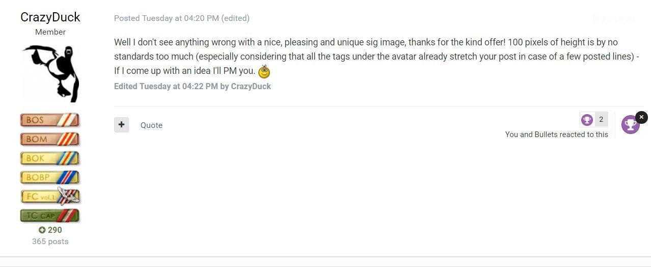 CrazyDuck Posted January 22, 2019 Posted January 22, 2019 (edited) Well I don't see anything wrong with a nice, pleasing and unique sig image, thanks for the kind offer! 100 pixels of height is by no standards too much (especially considering that all the tags under the avatar already stretch your post in case of a few posted lines) - If I come up with an idea I'll PM you. Edited January 22, 2019 by CrazyDuck 2