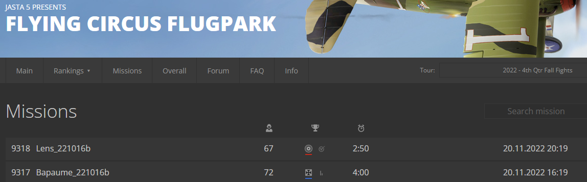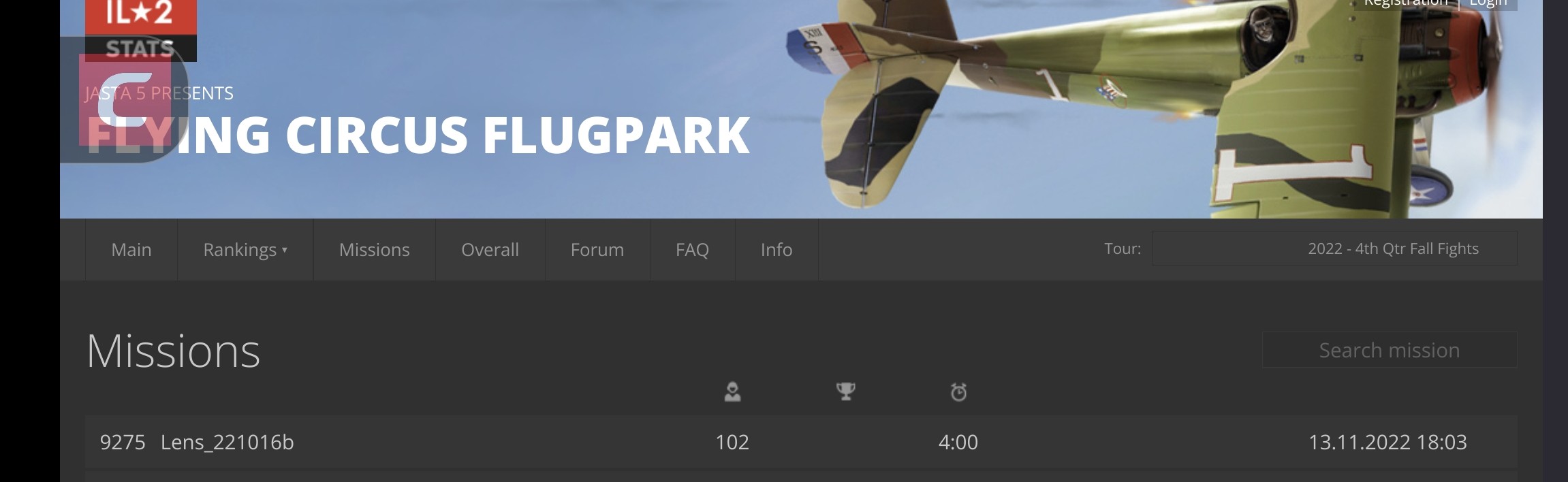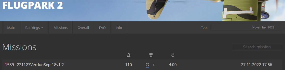 JGr2/J5_Baeumer Posted November 5, 2022 Posted November 5, 2022 (edited) NOTE: This weeks event will feature a new Vintage Mission designed and scripted by IRFC_Echo that was play tested Friday successfully that centers around 1917 Vimy Ridge. The mission will run 4 hours long. Stats will be reported on a different parser separate from the Flugpark parser for this week only. Afterwards the regular Flugpark mission will run. We look forward to the prospect of hosting more missions from Echo who is reviving the Vintage Missions with blessings from Syn_Vander. Echo has shared plans for other mini missions that may appear weekdays on the Flugpark, which continues to support and host community mission builders with a platform to put their work forward to benefit the community. Flying Circus Flugpark Furball! When: Sunday Time: 19:00 UTC/GMT (convert to your local time zone) REVERT BACK one hour to STANDARD TIME in various parts including parts of North America. Where: Flying Circus Flugpark Type: Dogfights and two-seater missions (drop in & drop out anytime). Entrance: Everyone welcome, regardless of experience. Come fly and have fun! Communications - Flugpark Discord: https://discord.gg/sStewGJXPQAfter Action Reports and Earned Pilot Awards (aka Flugpark Parser) - http://stats.jasta5.org:8002/en/ Edited November 10, 2022 by J5_Baeumer 1 1