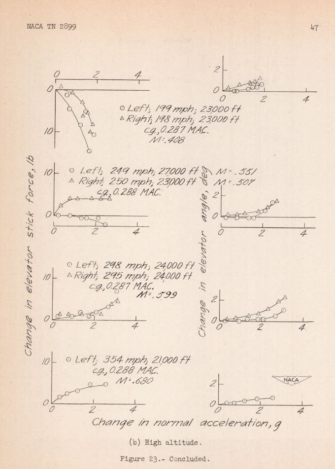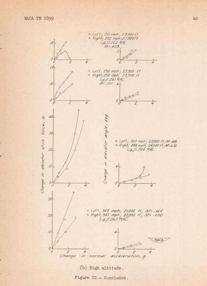 Voyager Posted February 7, 2019 Author Posted February 7, 2019 6 hours ago, =362nd_FS=RoflSeal said: http://www.wwiiaircraftperformance.org/p-47/Naca_TN_2899__F-47D-30_Flight_Test.pdf P-47D-30, but as far as I am concerned, it is suitable.The two major additions, the tail fin extension was to counter yaw instability, and dive flaps to aid in getting out of a high speed dive. Not what we are dealing with. Rather interesting reading through that. I'm trying to make sure I understand what the charts are saying. One of the things that jumped out at me was the high altitude, low speed turn charts: Forward CoG (pg 45) | Rearward CoG (pg 47) So, am I understanding the Rearward CoG turn chart: 199 mph, at 23,000 ft. Is that actually saying you need a *negative* stickforce to maintain a 2G turn? I.e. You roll over then push down on the stick to go up? It also seems to be implying in the CoG forward configuration, that, in the right turn at 298mph at 24,500 ft, it requires 50lbs of stick for to get a 3g turn, with a total 4 degrees of deflection on the elevator? Are those correct readings of what we're seeing in these charts? Thank you, Harry Voyager