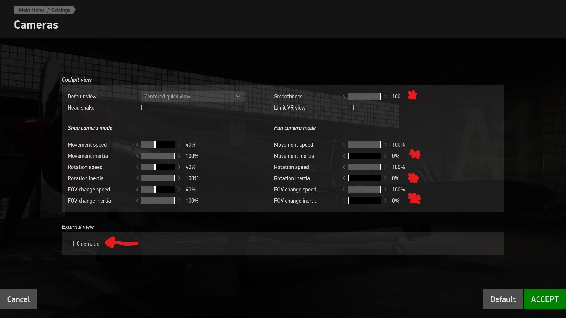 THERION Posted February 12, 2019 Posted February 12, 2019 17 minutes ago, 303_Kwiatek said: not smooth looking around with Track IR even if FPS are high Have you tried the following settings? I did help a lot to me with my TrackIR. Smoothness can be set between 80 and 100. Set all inertia values to 0% for the "Pan camera mode". Speed between 50 and 100. Hope to help you with this. Cheerio