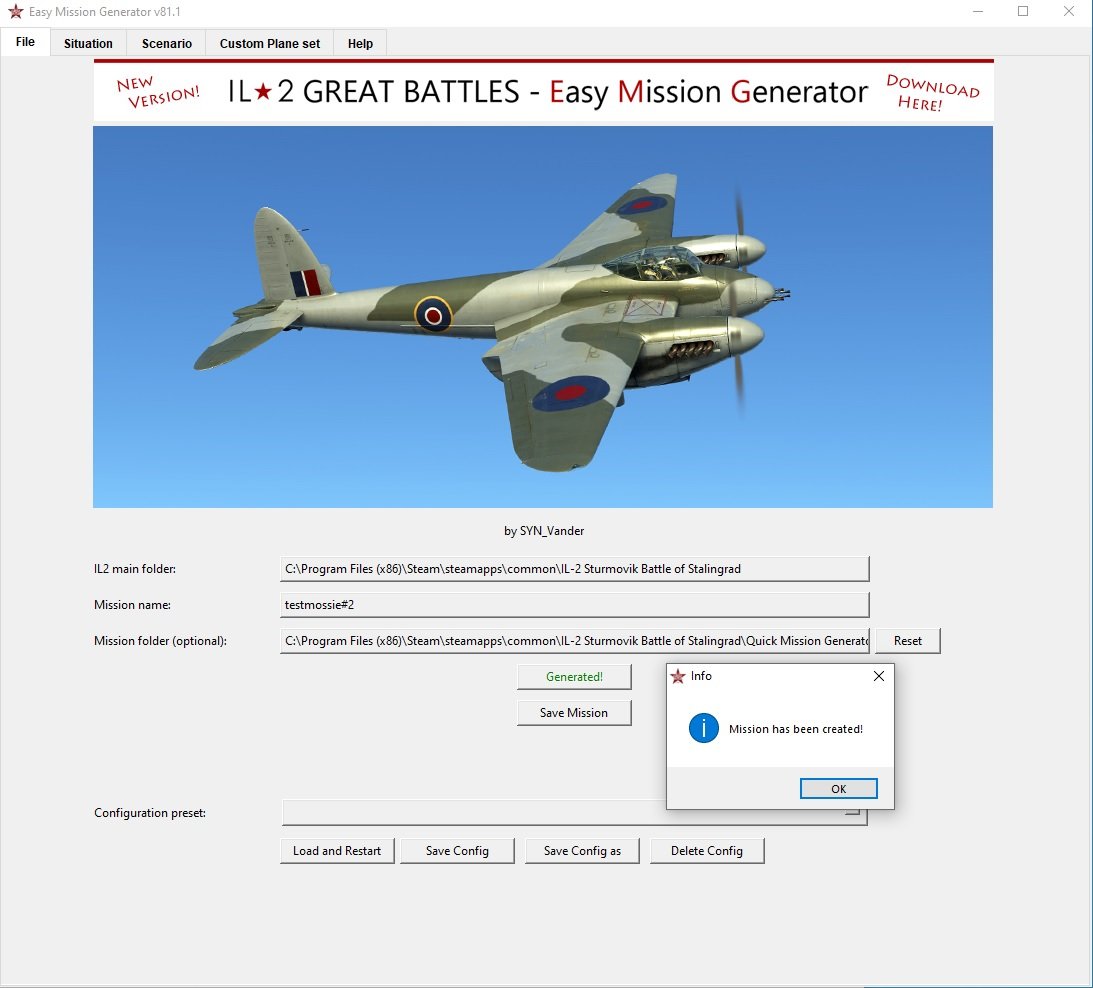 SYN_Vander Posted February 15, 2024 Author Posted February 15, 2024 (edited) 35 minutes ago, Mosquito said: Hi Syn-Vander, thanks for helping... please see the pictures: - I choose a situation. - choose a scenario. - plane set is default, i changed nothing - i create the mission, it has been saved in the folder which is selected in the File Screen - Mission is saved, but .list file is empty. Can you try by generating in the default mission folder instead of whatever you selected? So click on the "Reset" button behind "Mission folder (optional)". Then try again. Oh and also, you are not using latest version. Which is v82.1 https://sites.google.com/view/il2-great-battles-emg/home Edited February 15, 2024 by SYN_Vander