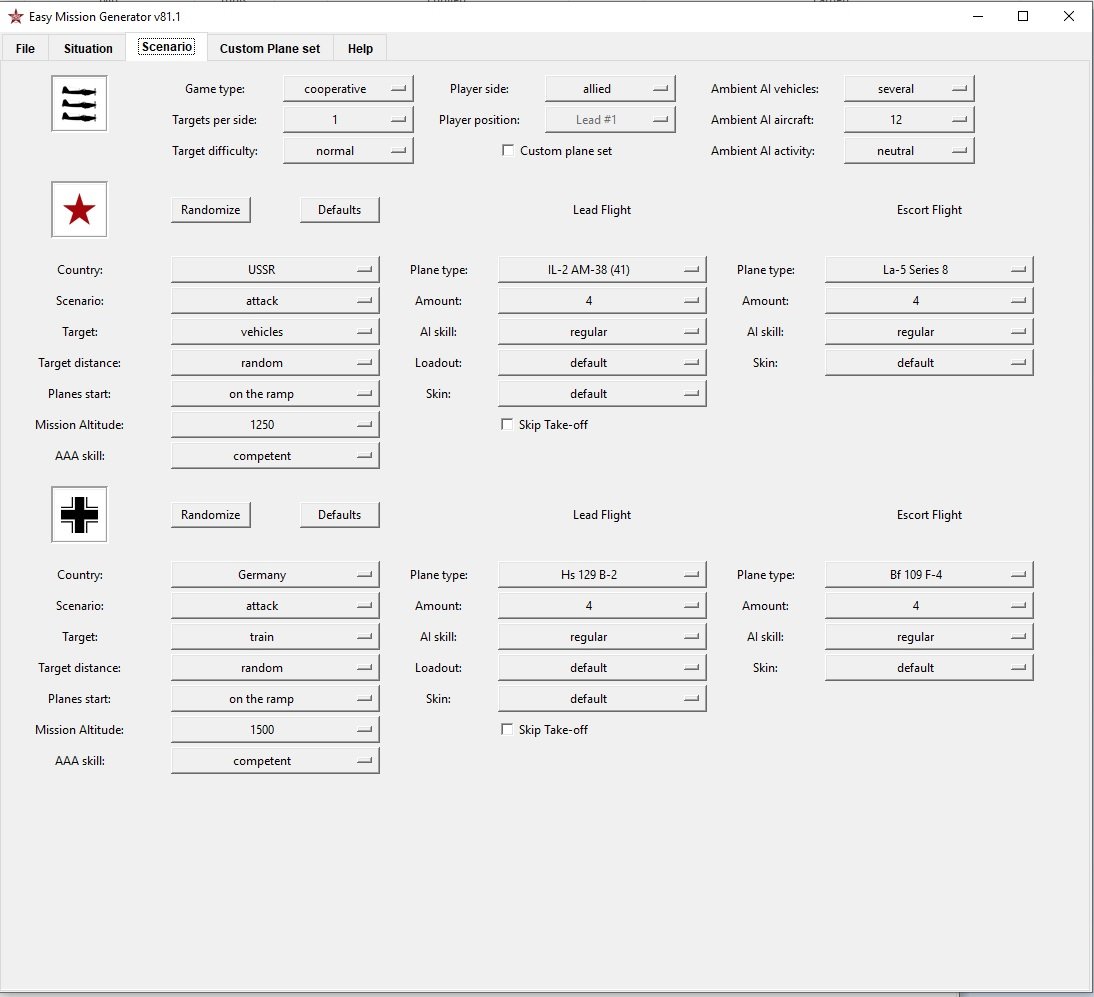 SYN_Vander Posted March 8, 2024 Author Posted March 8, 2024 (edited) New update featuring some bug fixes and small enhancements: Version 84 -Escort plane type can now be set even if the scenario is set to random. -If a side is not playable, EMG will also randomly select AI-only planes for that side. -Moved the list of AI-only planes to a separate file "planes_ai_only.json" so it is possible to be managed by the user. -Fixed bug that a combination of certain seasons and maps would result in an error. -Fixed a bug where generator would stop if no targets could be found within requested target distance range. -Fixed a bug with Channel/Normandy map bitmap being too small. -Removed custom icon from executable as it may prevent false positives from virus checkers. Get EMG here: https://sites.google.com/view/il2-great-battles-emg/home Get updated server generator here: https://sites.google.com/view/il2-great-battles-emg/emg-for-servers Edited March 8, 2024 by SYN_Vander 8 1