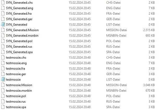 SYN_Vander Posted February 15, 2024 Author Posted February 15, 2024 59 minutes ago, Mosquito said: Hello all, i need your help. I can not run a generated mission on our server. Two experienced squad memebers told me, that maybe the problem is caused by the generated .list file. It is empty (0kb). I tried to create several missions, the file is always empty. I use v8.2, installed it new, changed to v8.11, with no success. Now, i dont know what to do.... Maybe you can help me.... Would appreciate an answer. Indeed, the .list file -that tells other clients what other files to download- should not be 0kb. But I can't reproduce this problem. When I generate a mission it has proper content. I would need more information on how you created the mission.
