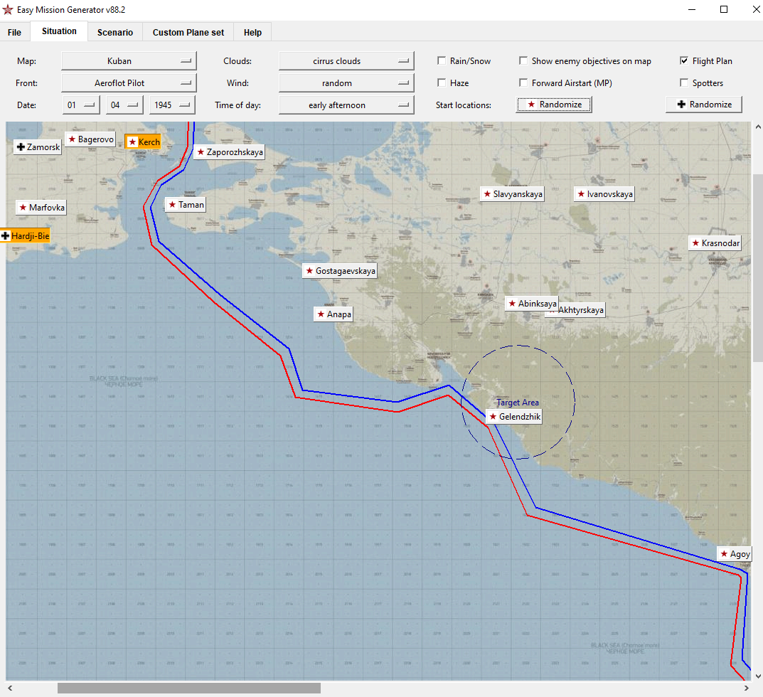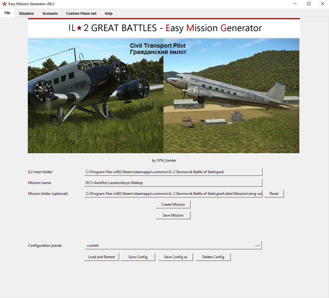 kraut1 Posted May 10 Posted May 10 (edited) Easy Mission Generator is suitable to be used for Peace Time Civil Missions too. I am currently working on a Civil Transport Pilot IL-2 Mod + a EMG Modification. By deactivating all military target objectives, using only searchlights for AAA batterys, and selecting only not-armed planes (Ju52, C-47(DC-3) and U-2) it is possible to create civil missions and to land on airfields on the normally enemy side. Some Fighter planes with civil skins are defined in EMG without ammo load and the AI pilots are performing spectacular aerobatic maneuvers. The front line that is normally visible in IL-2 can be eleminated by reducing it to a short 5km part. Even Airfields can be located in the normally enemy area and they are working: Edited May 15 by kraut1 3 1