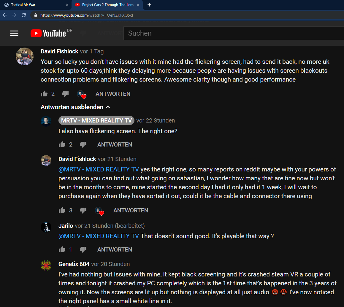 SCG_Fenris_Wolf Posted June 14, 2019 Posted June 14, 2019 (edited) The guy from MRTV, who was really hyping the headset, has the cable issue as well now. See the screenshot below. I'll check the Reverb out in a few months. As mentioned, I have cancelled my order on it. I'm not buying a (currently) broken design, and I'm bummed about the super narrow FOV that's smaller than even Gen1 headsets. At the same time, I feel sorry for SpitfireJoe and those who were looking forward to it. I hope you get a headset soon you can properly use, and enjoy IL-2 with, or at least a full refund. Maybe they'll do revisions of their Hardware, like Pimax did last year, with their redone P2 versions of Pimax5k+ with better cables and sturdy plastic. They got excellent support now (answer within a day, use TeamViewer, RMAs possible). They even sell with a full year of Warranty, no questions asked. HP currently looks like at the point Pimax was last year. Let's hope they can improve. In the meantime, brace for more bad reputation of this headset to come. Edited June 14, 2019 by SCG_Fenris_Wolf 2 1