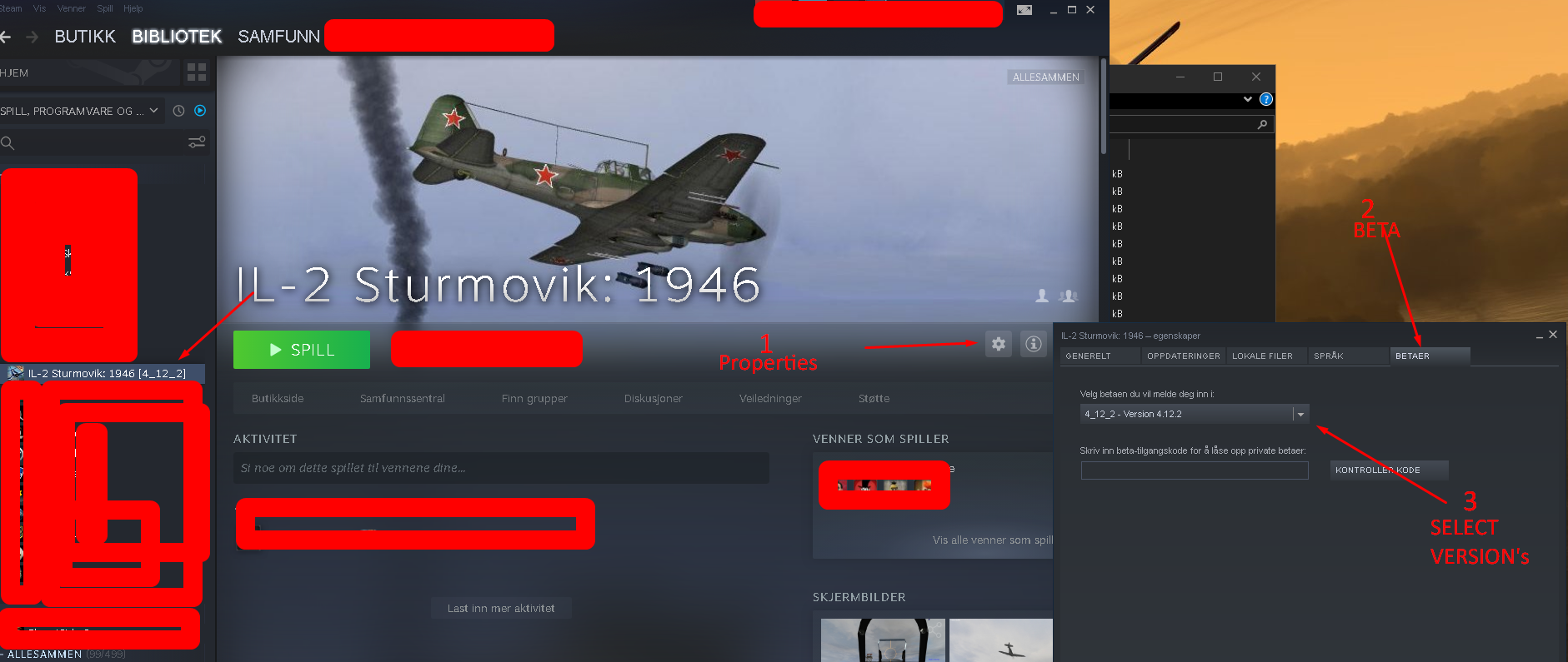 Papagon2 Posted May 3, 2020 Posted May 3, 2020 (edited) Hello, Just wissited this forum to actully see if the game is still active. So than I sea this post and wish to help out from my experiance. I do/did have the game on CD back in OLD OLD days, but unfortnatly I was not able to get the CD version to work at all on Win 8. (when Win 8 was out, was allso my last try to get CD working) So I had to buy it again and since I am STEAM fan I found it there and buyed it again. Now I run it fine with mods allso (have to check thows mods out guys! comes back to that.) My spec's are: Win 10 64-bit Intel-core i7-7700k GeForce GTX 1080ti 32gb RAM DDR4. TrackIR 5. Works fine!. (this I don't know if it is the mods that does it.) On steam version the game runs fine without beta's or mods installed. BUT it allso worsk with mods and betas. Now I run the game on Version 4_12_2 due to the mods I got. To change version on steam: plz open Picture to see how. For the Mod's that will make you able to fly I think EVERYTHING il2-1946 or WW2 planes got follow this link to my GUIDE. https://steamcommunity.com/app/15320/discussions/0/1620599015913791192/ And scroll down to my comment. Theoneandonly[2BNB] 28 steps. Now hope this helps some good old il-2 1946 fans. AND sorry for bad English! Regards! Edited May 3, 2020 by Papagon2