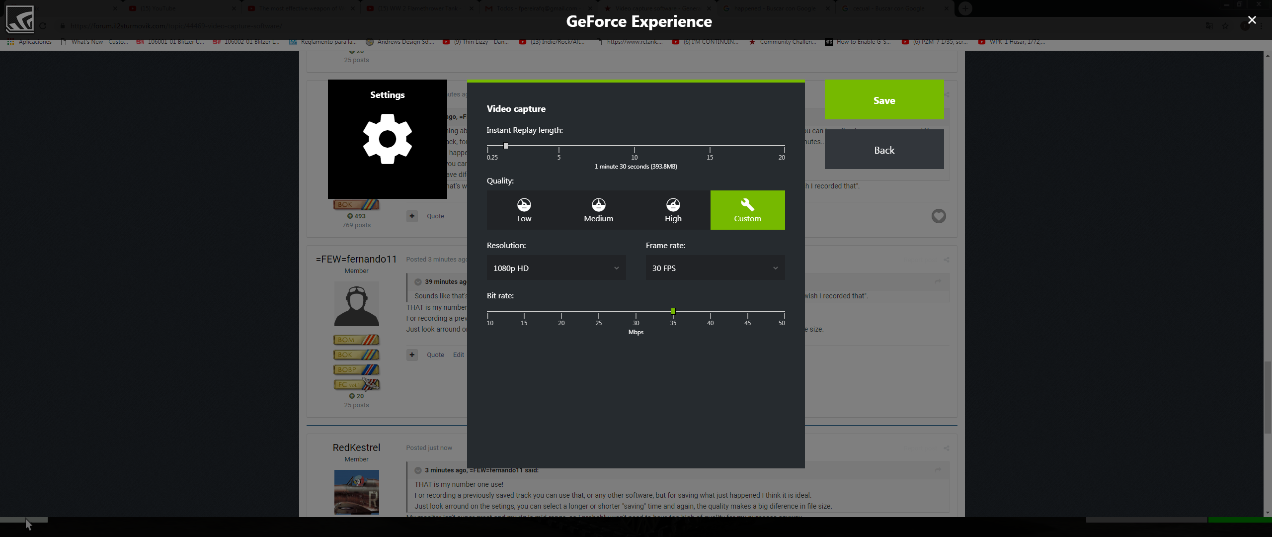 =FEW=fernando11 Posted March 29, 2019 Posted March 29, 2019 The nice thing about NVidia shadow play, is that it should be free to yo, it doesn´t seem to take a big hit on performance, and you can have it set up so you can record X minutes back, for example, you have the "app" runnin, something interesting hapens, you press A KEY and it saves the last X minutes... I have is set at 1:30, so if anyting interesting happens while on MP, I can choose to save it AFTER IT HAPPENED. Ofcourse you can use it as a regular recoding software, and select when to start, and when to stop. you also have diferent setings for audio and video quality. 1 1