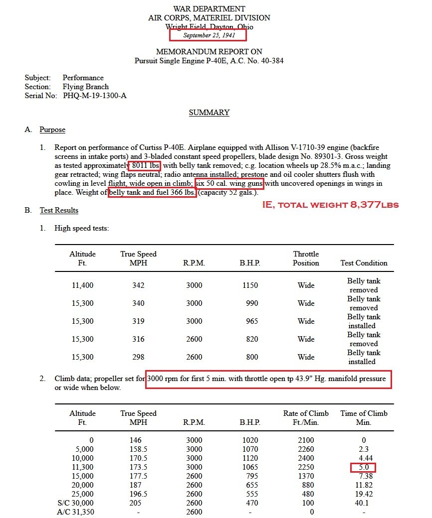 Venturi Posted March 30, 2019 Posted March 30, 2019 (edited) In the pilot's notes for this aircraft, it is stated, to place the engine at take off power (46" hg manifold pressure and 3000rpm) until the aircraft reached 2,200 feet altitude - then to leave it at 42" hg and 3000rpm until critical altitude achieved, which was 12,000 feet altitude. On those settings, the P-40E climbed at about 2,000 feet per minute. Therefore, based on the performance of the aircraft and those instructions stating for routine climbs, that the length of time in each power setting was 46" / 3000rpm = 1min 42" / 3000rpm = 5min Total of 6min. This is not "combat power" but climb power. The USSR did not use 100/130 octane fuel as the western allies did - this is reflected in the reduced engine limits placed on the aircraft in the Russian manual. They used 80-90 octane fuel from domestic production in 1941, sometimes admixing it with imported western allied 100 octane fuel. We should assume that the aircraft is operating using the CORRECT fuels as it was designed for, as every other aircraft is simulated. Attached is corresponding document from http://www.wwiiaircraftperformance.org/P-40/P-40.html Also recommended is this read. Note that Crump was later banned from this forum. Edited March 30, 2019 by Venturi more info, go ahead and debate it