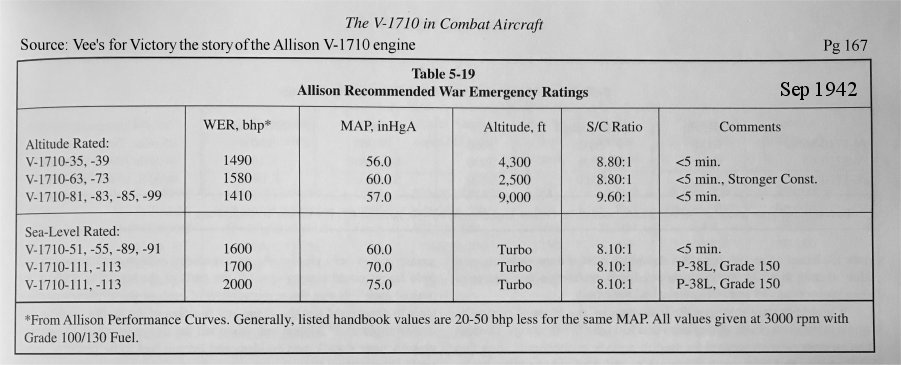 Bert_Foster Posted April 20, 2019 Posted April 20, 2019 (edited) Another indication of what the V1710-39 was good for 56" for 5 min. As tabled by Allison in Sep 1942. From the book Vee's for Victory The story of the Allison V-1710 engine. So further evidence that even the -39 was not quite as soft/delicate as it would appear in the Sim. Though Fuel is 100/130 Edited April 20, 2019 by Bert_Foster