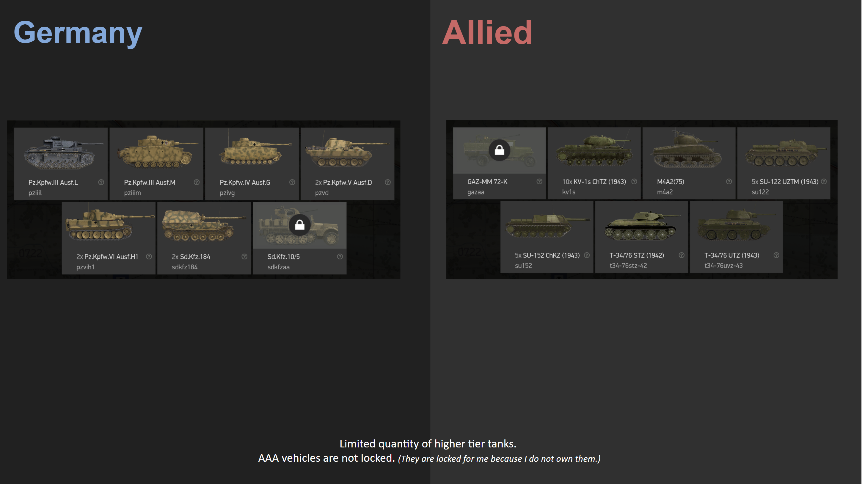 Sketch Posted December 7, 2021 Posted December 7, 2021 (edited) 23 minutes ago, Robli said: Are there plans to add tanks to other missions, too? Out of curiosity, will the Allies have only Sherman for now? Yes, but not all missions will be able to support tanks. (Such as The Crimean Offensive, where players are battling across the channel.) You can find all the information on tanks and more on our Discord. Here is the current tank line up for all maps. Please note: I do not own the AAA vehicles, so they look locked, but they're available if you own them. Edited December 7, 2021 by Sketch 1