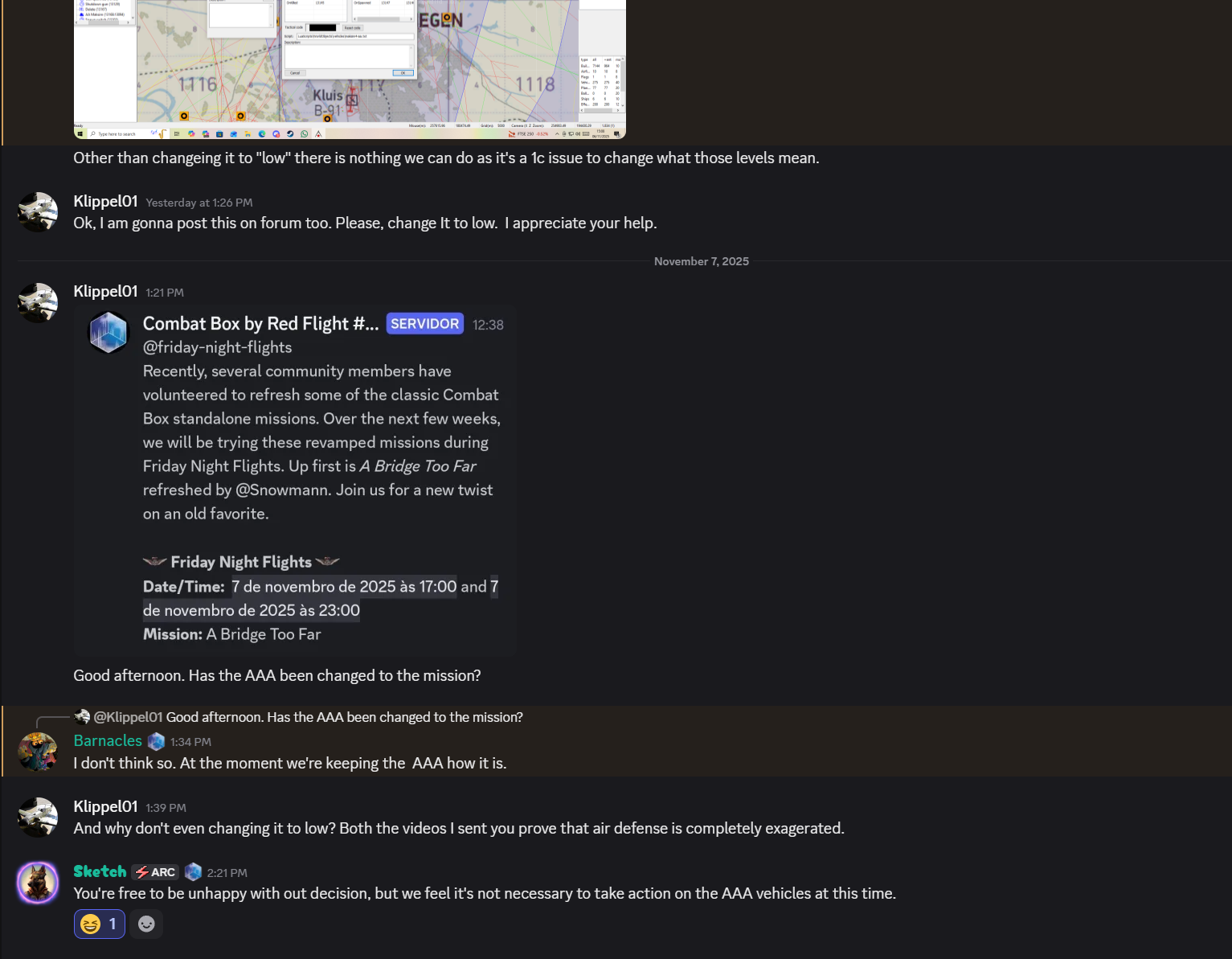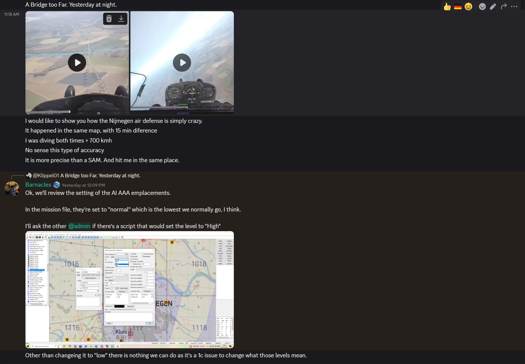 9JG54_Klippel01 Posted November 7 Posted November 7 At Nijmegen Bridges, map "A Bridge too Far", there is an interesting AAA that seems to be more efficient than SAM missiles. I already reported to Combat Box admins who explained it was at "normal" level of accuracy. However, there is nothing "normal" an AAA battery getting to hit me, in both my raids, on a + 700 KM/H dive bombing, breaking my wing twice. Both times, it happened in the same map, with approximately 15 min from each situation to the other. They said, as showed in the photos, 1C should review what these levels of accuracy really mean and adjust it. Here it is the link of the situation: