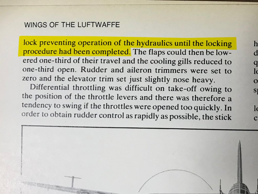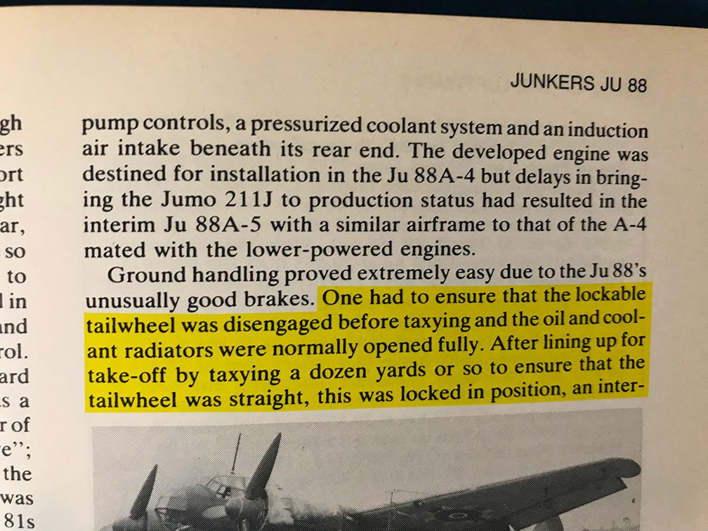 spudkopf Posted April 4, 2019 Posted April 4, 2019 (edited) Well I'm glad someone mentioned the Ju88 here, as the absence of a tail lock on this type has been a question in my mind for quite some time, my google searches have frustratingly only ever been able to find the one translation of the pilot notes, this being the same one that everyone seems to quote when the question of a locking tail wheel for the Ju88 is raised. This solitary source for me is not really enough proof, however I'm happy to go along with it but for two contradictory accounts from two separate and respected authors. The first is Peter Wilhelm Stahl, in his first book "The Diving Eagle" (well first in English anyways) he goes to great lengths to try and impart the experience of flying the Ju88 in combat during operations in France for attacks on England, in one passage he gives a quite detailed account of taking off, where locking of the tail wheel is mentioned as one of the very final checks, before beginning the takeoff run (see below). Spoiler The second is Captain Eric Melrose "Winkle" Brown, in his account of flying the Ju88 in "Wings of the Luftwaffe" he also talks of setting the tail wheel lock (I will dig out my copy and the reference info after work). Granted the above examples are both recollections, yet that being said Stahl lived and breathed the Ju88 day in and day out during the war, and as for Winkle, I would assume that he would have been able to refer back to his technical notes that he took at the time (as was his job) for that type when his later account his was written. In short I'd like to see some other evidence maybe in the form of an original untranslated copy of the Ju88's Pilot notes, or even an allied technical report that clearly show there to be no wheel lock on the Ju88, to be able to put the issue to rest once and for all. Edited April 4, 2019 by spudkopf Grammar correction 2