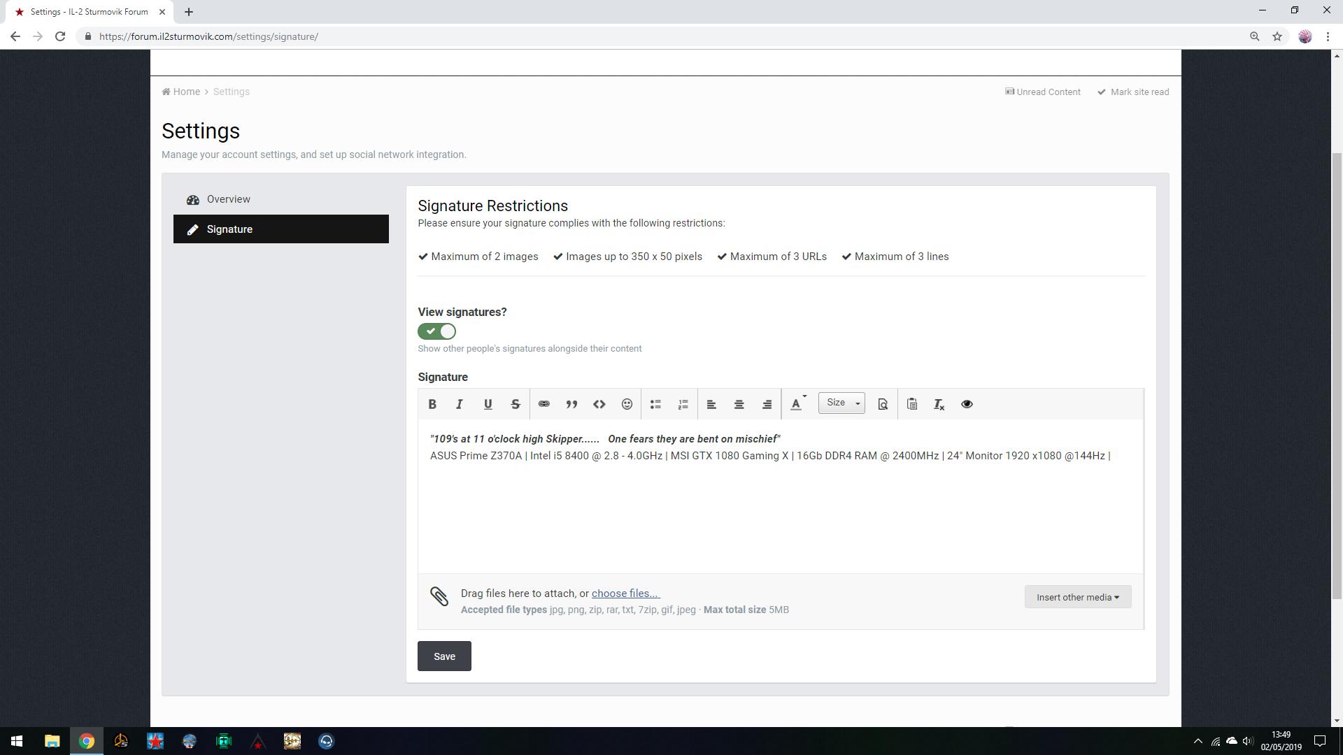 [DBS]MDS1 Posted May 2, 2019 Author Posted May 2, 2019 15 minutes ago, jaygee485 said: Edit: Or, does 'signature' refer to something other than profile? Yes, it does. The "Signature" is at the bottom of my post. However, it is possible that it doesn't show for some reason. (maybe I have fiddled with a Forum display setting I shouldn't have.... lol!) For the record my system is as follows.... Intel Coffee Lake i5 8400 Cpu @ 4.0Ghz | MSI GTX 1080 Gaming X GPU | Asus Prime Z370-A Motherboard | 16 GB DDR4 RAM @2400Hz | Windows 10 | and an Asus 24" 1920X1080 144Hz Monitor. Nice, but nothing special. I hope that helps! ? P.S. Look at the bottom of this post to see if a signature shows...... Having had a quick look at forum settings.... it could be that you don't have "View Signatures" enabled. Please see attached screenshot for explanation. Go to your profile, look under settings and check the signature box is enabled. Kind Regards, MDS1 1