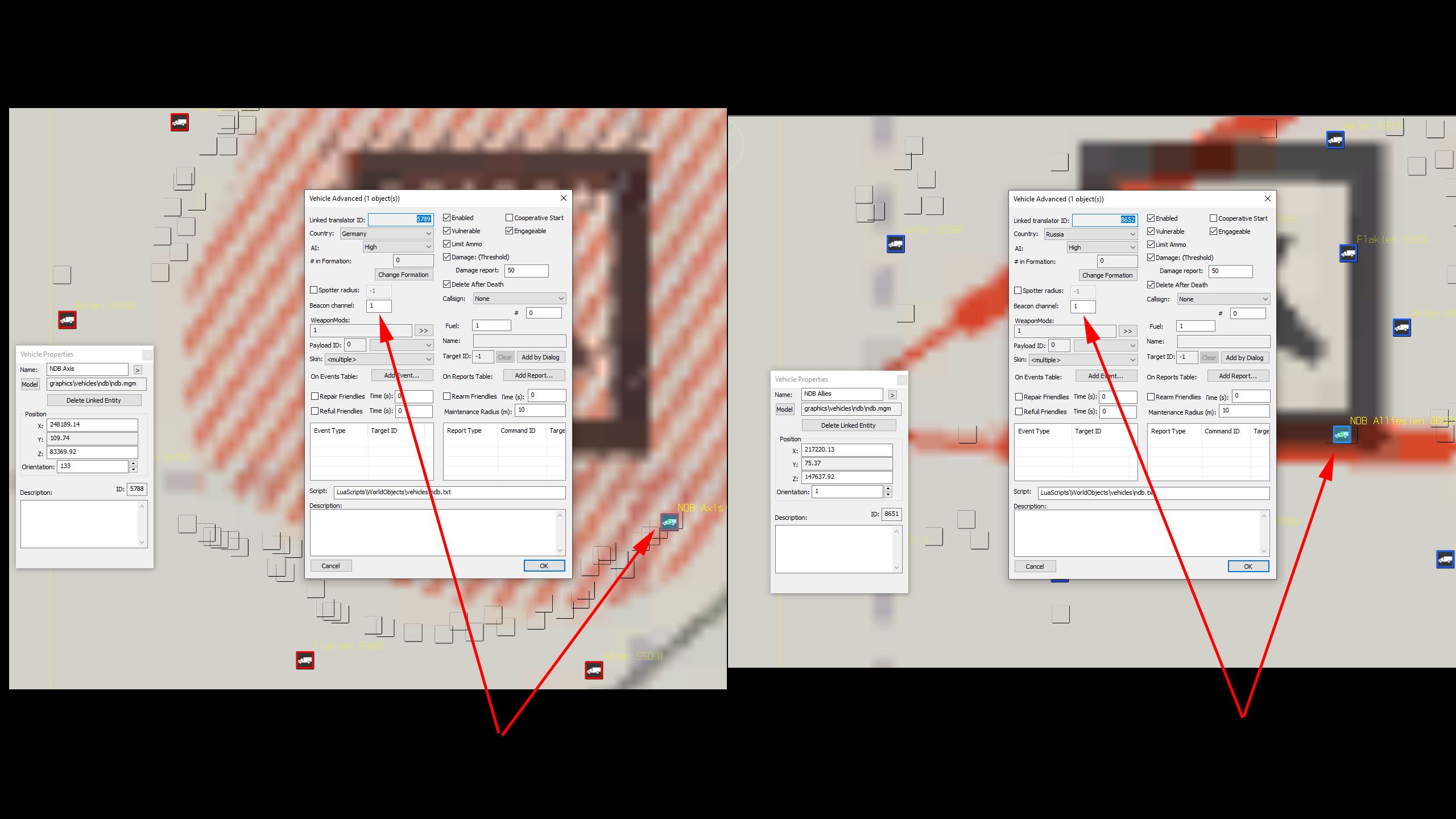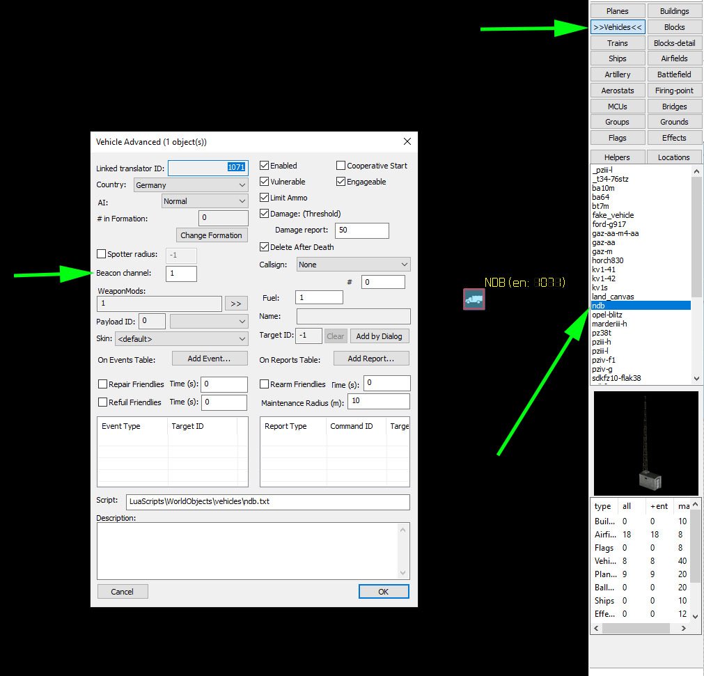 BubiHUN Posted April 23, 2019 Posted April 23, 2019 6 hours ago, ACG_Sketch said: An image to support @TP_Silk's post: Notes: - In order to modify the NDB, you must make it a linked entity. - Beacon channel is sort of like an on-off switch. Both Russian and German should be set to 1 for on, 0 for off. - There are ways to modify the beacon channel when other events fire off. No, NDB channels are 1 is for Axis, channel 2 is for Allied.