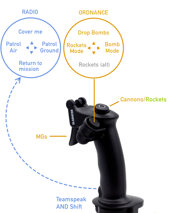 von_Michelstamm Posted May 23, 2019 Author Posted May 23, 2019 These are my VKB stick settings, i think they're a faithful adaptation of how the real KG12, etc. worked: A (trigger) KNOPF: IRL: machine guns VKB: same B1 (top) KNOPF:IRL: Cannons. If the pilot wanted to fire rockets, he would have to flip a switch elsewhere in the cockpit to make this button fire rockets, and then switch it back to return to cannons.VKB: I use the "mode" button on the base of my gladiator to switch to "rocket" mode, and back. B2 (side) KNOPF: IRL: Bombs. it wasn't a hatswitch, it was a single button.VKB: bombs, but the extra hat buttons control bomb and rocket modes (firing in pairs or singular or which bombs to drop first). There's a perfect free button here (in gray) to 'fire rockets' as well, but that isn't technically correct. Pinky KNOPF: IRL: Push to TalkVKB: I used the vkbconfig software to make this function as BOTH a shift key (which is what it normally does) AND as a joystick button. When pressed, it transmits to teamspeak (for playing multiplayer). It simultaneously shifts the B2 knopf into a set of squadron radio commands (for single player). 1