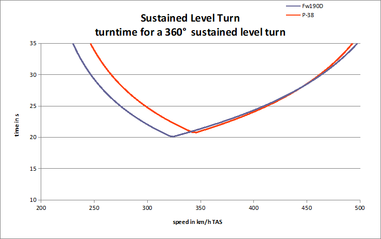 JtD Posted October 25, 2019 Posted October 25, 2019 (edited) You can't, or at least shouldn't, translate these figures directly into turning performance. Parasitic drag is missing completely from the equasion. But, generally speaking, the above is relevant for the thrust limited side of the curve, i.e. medium speeds. Owing to the higher wing loading of the P-38, the Fw190D would be able to fly the tighter turn and have the peak turn rate at the lower speed. This probably also means a higher turn rate. The Fw190D is also faster at low to medium altitude, so it would also be superior in the high speed part. Somewhere around the middle speed regions the P-38 would have some advantages. Something like this: Things change when the P-38 deploys flaps. Then I'd expect it to be superior or at least equal to the Fw190D in the low speed region, with a higher maximum turn rate at low speeds. Something like this: Edited October 26, 2019 by JtD