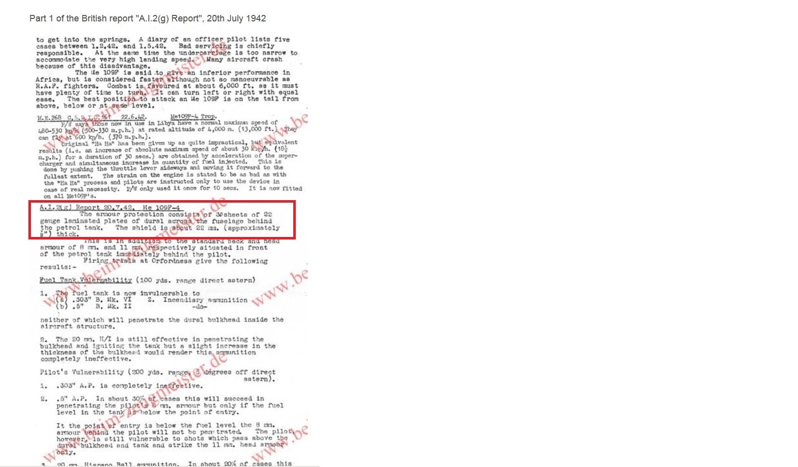 Kurfurst Posted October 11, 2019 Posted October 11, 2019 7 minutes ago, -[HRAF]Roland_HUNter said: I hope everyone of you know, from the Bf-109 G-2 behind the fuel tank, there isa 27mm thick armor plane, so if u shot the 109 from the back, there should be no fuel tank leak from 500-600 meter or closer. Even 50 cal can only pen 16mm of armor of steel from 500 meter. So :))) Actually it’s just several layers (about 30) of thin aluminium sheets and it does just about nothing to stop a bullet unless it’s a .303 or similar. It’s not near 30 mm steel armour plate as it would prohibitively heavy. More of scrap aluminium sheets formed into several layers of thick sandwhich and placed as a bulkhead behind the fuel tank. What it did was to slow down the bullets sufficiently so that by the time it got to pilots armor plate (and passing through the fuel tank) they could no longer defeat it. This worked rather well up .50 AP provided the bullet entered beneath the fuel line. More importantly what this dural plate sandwich armor also did was to render incendiaries ineffective and they could not set the fuel tank on fire. Soviet Berezhin API rounds however remained effective so the USAAF actually made straight copies of them later in the war (M8 API iirc). 1