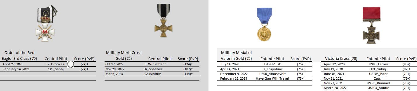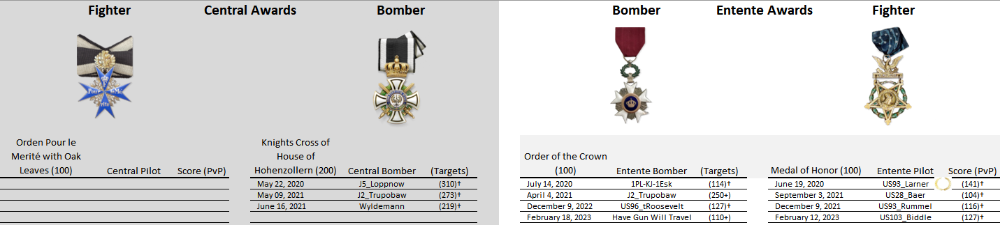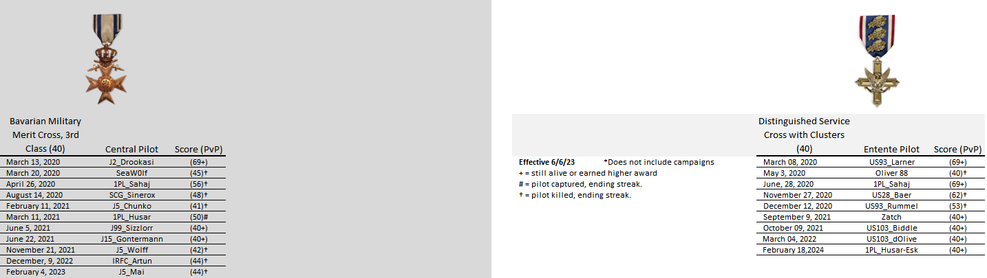 JGr2/J5_Baeumer Posted October 13, 2019 Posted October 13, 2019 (edited) Below are posted "Honor Rolls" from the Flying Circus Flugpark full-real multiplayer server. The FC Flugpark parser can be visited at www.Flugpark.org. After flying on the Flugpark you can view your pilot stats, including own awards and promotions earned! Just visit the parser and locate your pilot and click on your pilot name in either the pilot ranking tab or your squad tab and then the "awards" tab. The list below will be updated to include new pilots meeting the 20 victories requirement, involving live pilots* on the Flugpark Server. Other awards may be earned and displayed in the Flugpark for scoring victories in combination of Person vs. Person (PvP) and Artificial Intelligence (AI). There are also promotions you earn for flying time survived over The Front. Good luck! Thank you to community members for their help tracking pilots. Honor Rolls For more information on community awards criteria and precedence, see the following thread (click the spoiler link): Spoiler Edited November 29, 2024 by JGr2/J5_Baeumer Updated pilot records 10 3 1 2