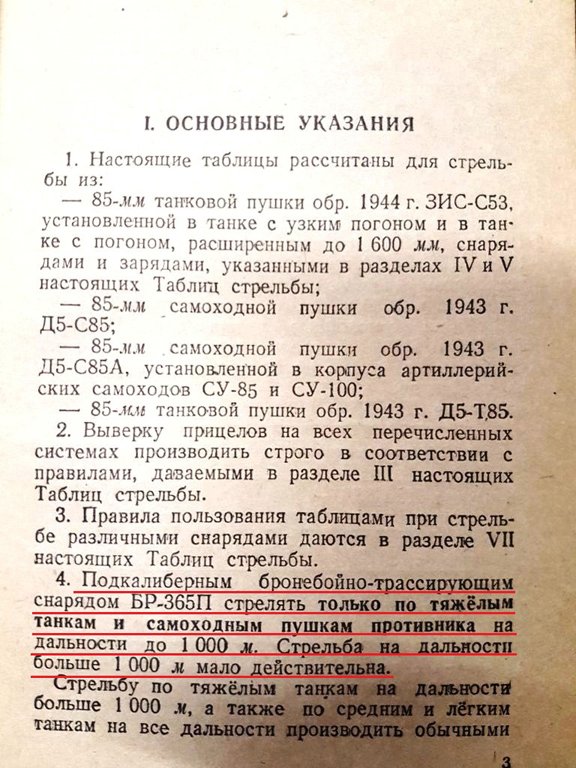 07SharKhan Posted October 19, 2019 Posted October 19, 2019 (edited) Основные указания 1. Настоящие таблицы расщитаны для стрельбы из: - 85-мм танковой пушки обр. 1944 г. ЗИС-С53 , установленной в танке с узким погоном и в танке с погоном, разширенным до 1 600 мм, снарядами и зарядами, указанными в разделах "4" и "5" настоящих Таблиц стрельбы: - 85-мм самоходной пушки обр. 1943 г. Д5-С85 - 85-мм самоходной пушки обр. 1943 г. Д5-С85А, установленной в корпуса артиллерийских самоходов СУ-85 и СУ-100 - 85-мм танковой пушки обр. 1943 г. Д5-Т85. 2. Выверку прицелов на всех перетчисленных системах производить строго в соответствии с правилами, даваемыми в разделе "3" настояших Таблиц стрельбы. 3. Правила пользования таблицами при стрельбе различными снарядами даютсяв раздле "7" настояших Таблиц стрельбы. 4. Подкалиберным бронебойно-трассиюрущим снарядом БР-365П стрельать только по тяжёлым танкам и самоходным пушкам противника на дальности до 1 000 м. Стрельба на дальности больше 1 000 м мало дейцтвительна. Стрельбу по тьяжёлым танкам на дальности больше 1 000 м, а также средним танкам на все дальности производить обычными ... снарядами ? Basic Instructions 1. These tables are cut for firing from: - 85 mm tank gun. 1944 ZIS-S53 installed in a narrow-cut tank and in a tank with a cut expanded to 1,600 mm, shells and charges specified in sections IV and V of the present Firing Tables: - 85 mm self-propelled gun. Model 1943 of D5-S85 - 85 mm self-propelled gun. Model 1943 D5-S85А installed in artillery self-propelled vehicles SU-85 and SU-100 - 85 mm tank gun. Model 1943 D5-T85. 2. Perform the alignment of sights on all overnumbered systems strictly in accordance with the rules given in sectionIII of the insisted Shooting Tables. 3. Rules for the use of tables when firing different projectiles in a single VIIof the insisted Shooting Tables. 4. A sub-calibre armour-piercing BR-365P tracer shell can be fired only to heavy tanks and enemy self-propelled guns at a range of up to 1,000 m. Shooting at a range of more than 1,000 m is little dateweet. Shooting on heavy tanks at a range of more than 1,000 m, as well as medium tanks at all ranges is performed by ordinary ones. .. shells? Edited October 19, 2019 by 07SharKhan