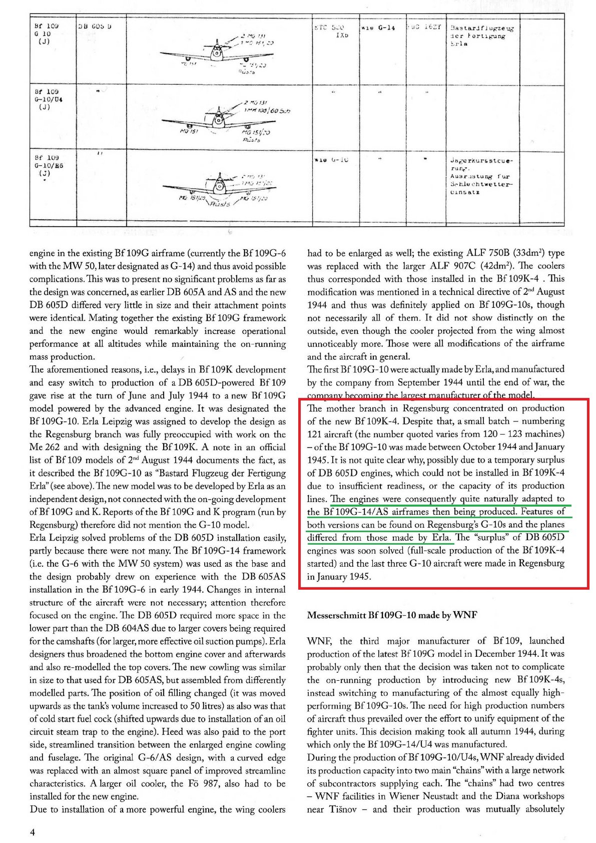 NZTyphoon Posted November 8, 2019 Posted November 8, 2019 To explain further: back in 1995 Prien & Rodeike wrote that some G-10s had AS engines (G-10/AS), but that has been superseded by later research that shows that all G-10s used DB 605Ds. The confusion comes with the shapes of the engine cowlings and associated fuselage fairings. Three main factories built the G-10: Messerschmitt Regensburg, Erla and WNF/Diana (Diana was a subsidiary of WNF) in Austria. Each had their own design of cowling and fairing: the Erla style, with the flat panel aft of the cowling, was mistakenly identified as the non-existent G-10/AS.