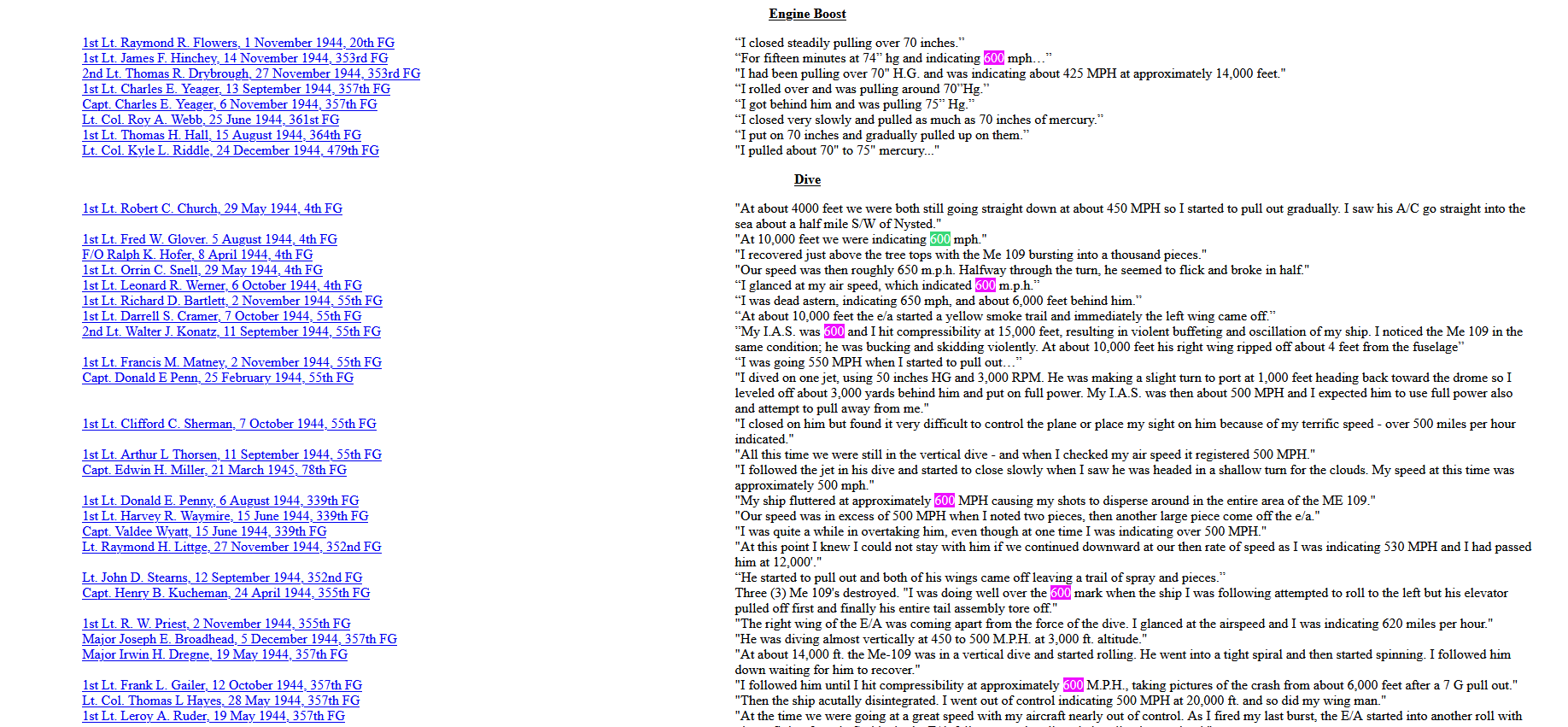 CUJO_1970 Posted November 26, 2019 Posted November 26, 2019 No P-51D should be doing 391 on the deck, with any type of fuel - that might be a reason for such loss of speed. Seriously, P-51 is doing 391 on deck? That's at least 12 mph/19kph faster than any speed test for P-51D on 150 grade fuel I've seen. That's the placarded dive restriction on P-51D posted above, as well as the explanation from Wright Field as to why those restrictions were implemented. Every aircraft had dive restrictions, so it's nothing out of the ordinary. If your looking for specific anecdotes on P-51 structural issue there are many of those, in Freeman's 8th AF history, or you can read Dean's America's Hundred Thousand. Dick Curtiss' Dumb But Lucky: https://www.google.com/books/edition/Dumb_But_Lucky/ZclvDwAAQBAJ?hl=en&gbpv=1&printsec=frontcover etc etc - there is abundant information on the subject.