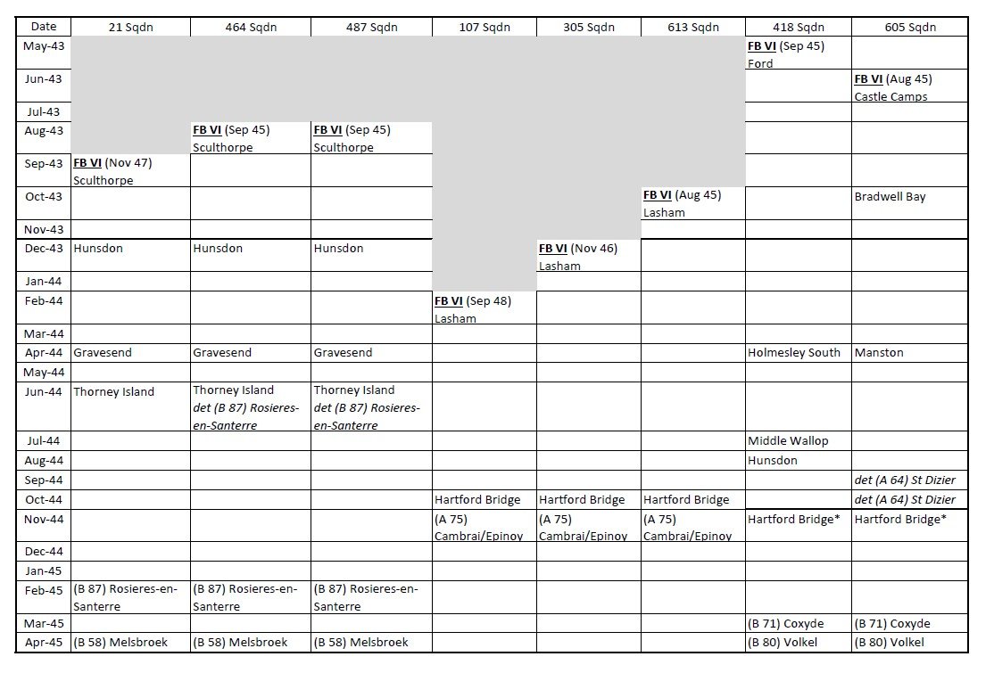busdriver Posted December 2, 2019 Posted December 2, 2019 (edited) On 12/1/2019 at 3:16 AM, Bremspropeller said: Would it be feasible to fly a Coastal Command Mosquito on the map? If you are a stickler (AKA anal retentive) then the answer based strictly on the map is NO. The jpegs show squadrons with their rough date of acquiring FB Mk VIs, and their assigned base (and transfers). Coastal Command bases are either off the left side of the map or waaaaay off the top of the map (northern coast of Scotland). Having said that, I'm all for including them just to get the rockets and the Mk XVIII. Various sources say between 19 and 29 of these were procured. They only carried 24 rounds for the 57mm, and eventually reduced the machine guns to two. Of note missing 618 Sqdn of Coastal Command trained with B Mk IVs (bombers) with the plan to use the Highball to attack shipping (Tirpitz). As it turned out that plan was scrapped, the crews scattered (later to be re-assembled to be sent to Australia) and a few were tasked to test the 57mm. These crew were 618 Sqdn Special Detachment assigned for administrative purposes to 248 Sqdn (just as they were converting from Beaufighters). Also not shown is 254 Sqdn that acquired a couple of Mk XVIIIs in March 1945. Contrary to the 2 TAF trilogy of books, I cannot find any reference to night fighter squadrons getting any Tsetse Mosquitos. Otherwise the three squadrons 23 Sqdn (returning from the Med inJun 44), 169 Sqdn and 515 Sqdn were assigned to 100 Group in support of Bomber Command. Some Mk VIs were equipped with radar, like 23 Sqdn's after being assigned to 100 Group, but I'm unsure how many of 169 and 515 were modified. The other FB Mk VI squadrons you could reasonably expect to see, six came from 2nd Group of Bomber Command that were assigned to 2 TAF. You can see when they transferred to the continent. You can see how these six were split between two wings, staying together (except for brief 2 weeks transfers elsewhere). The last two FB Mk VIs squadrons were 11 Group of Fighter Command up until Nov 1944. These squadrons were dedicated night intruder squadrons from their days in the Boston/Havoc. They rarely carried bombs, and never rockets. The 2nd Group squadrons flew a lot of day sorties prior to D-Day and afterwards the bulk of their sorties were at night (while the Bostons and Mitchells flew mostly day sorties). 2 TAF stood up in June 1943, and according to Martin W Bowman 2nd Group was assigned on 1 Jun 43. I'm searching my references but don't see any pictures of these airplanes carrying rockets, rather slipper tanks or bombs under the wings. [Always happy to be shown evidence they did...] And if one is sticking to the historical imperative and apparent map limitations, not all of these squadrons would be available all the time. Edited December 3, 2019 by busdriver 1 2 3