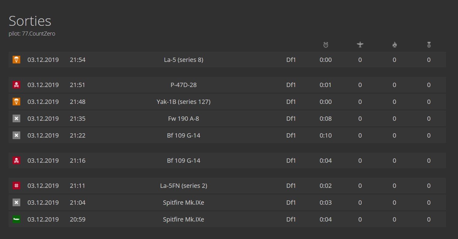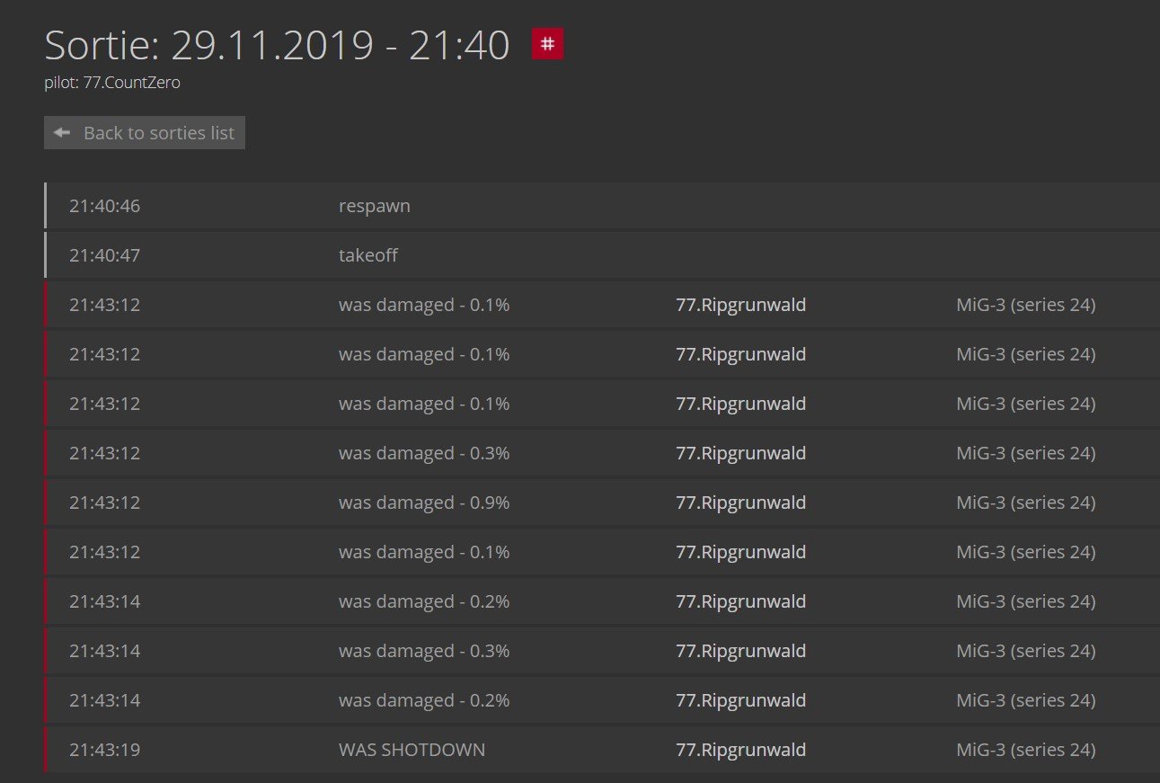 CountZero Posted January 19, 2020 Author Posted January 19, 2020 (edited) Small change in mod version 1.4, i added so event disconnected show up in players sortie log at time of disconnection from server. So its now easyer to know that disconnection happend in sortie where disconnection is turned in capture or bailout for example. Pictures how it looks: Spoiler Changed files from 1.3 are: report.py, sortie_log.py and stats_whore.py Spoiler in report.py self.logger_event({'type': 'disco', 'sortie': sortie}) is added on 2 places in event_player_disconnect, it should look like this: def event_player_disconnected(self, tik, account_id, profile_id): # self.online_uuid.discard(account_id) sortie = self.sorties_accounts.get(account_id) # TODO работает только в Ил2, в РОФ нет такого события if sortie: # you can determine the amount of damage that is considered dmg_pct=0 # the departure was completed, there was a jump, no plane was created, the plane on the ground, and the plane was damaged, # player disconection can then be changed into captured. if not (sortie.is_ended or sortie.is_bailout or (not sortie.aircraft) or sortie.aircraft.on_ground ) and sortie.aircraft.damage > dmg_pct: sortie.is_damageddisco = True self.logger_event({'type': 'disco', 'sortie': sortie}) # вылет был завершен, был прыжок, не был создан самолет, самолет на земле elif not (sortie.is_ended or sortie.is_bailout or (not sortie.aircraft) or sortie.aircraft.on_ground): sortie.is_disco = True self.logger_event({'type': 'disco', 'sortie': sortie}) in sortie_log.py , changes are 'disco': pgettext_lazy('sortie_log', 'DISCONNECTED'), and 'disco': 'grey', is added, it should look like this: messages_wo_opponent = { 'act': { 'respawn': pgettext_lazy('sortie_log', 'respawn'), 'end': pgettext_lazy('sortie_log', 'end'), 'disco': pgettext_lazy('sortie_log', 'DISCONNECTED'), 'takeoff': pgettext_lazy('sortie_log', 'takeoff'), 'landed': pgettext_lazy('sortie_log', 'landed'), 'crashed': pgettext_lazy('sortie_log', 'crashed'), 'ditched': pgettext_lazy('sortie_log', 'ditched'), 'bailout': pgettext_lazy('sortie_log', 'BAILOUT'), }, 'cact': { 'damaged': pgettext_lazy('sortie_log', 'damage'), 'wounded': pgettext_lazy('sortie_log', 'wound'), 'killed': pgettext_lazy('sortie_log', 'DIED'), 'destroyed': pgettext_lazy('sortie_log', 'DISABLED'), 'shotdown': pgettext_lazy('sortie_log', 'DISABLED'), }, } @functools.lru_cache(maxsize=64) def get_message(act_type, event_type, has_opponent=True): if has_opponent: return messages[act_type][event_type] else: return messages_wo_opponent[act_type][event_type] colors = { 'act': { 'respawn': 'grey', 'end': 'grey', 'disco': 'grey', 'takeoff': 'grey', 'landed': 'green', 'crashed': 'orange', 'ditched': 'orange', 'bailout': 'orange', 'damaged': 'green', 'wounded': 'green', 'killed': 'green', 'destroyed': 'green', 'shotdown': 'green', }, 'cact': { 'damaged': 'red', 'wounded': 'red', 'killed': 'red', 'destroyed': 'red', 'shotdown': 'red', }, } and in stats_whore.py, in def stats_whore(m_report_file): , in for event in m_report.log_entries , this 4 lines are added in 314, 315, 316 and 317: elif event['type'] == 'disco': params['type'] = 'disco' params['act_object_id'] = event['sortie'].sortie_db.aircraft.id params['act_sortie_id'] = event['sortie'].sortie_db.id Edited January 19, 2020 by CountZero