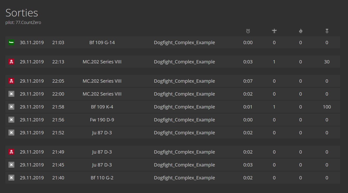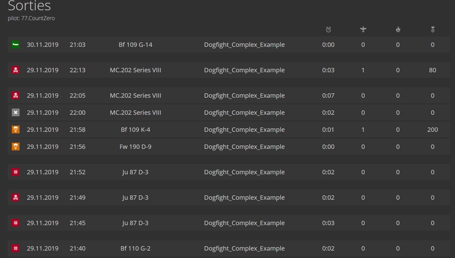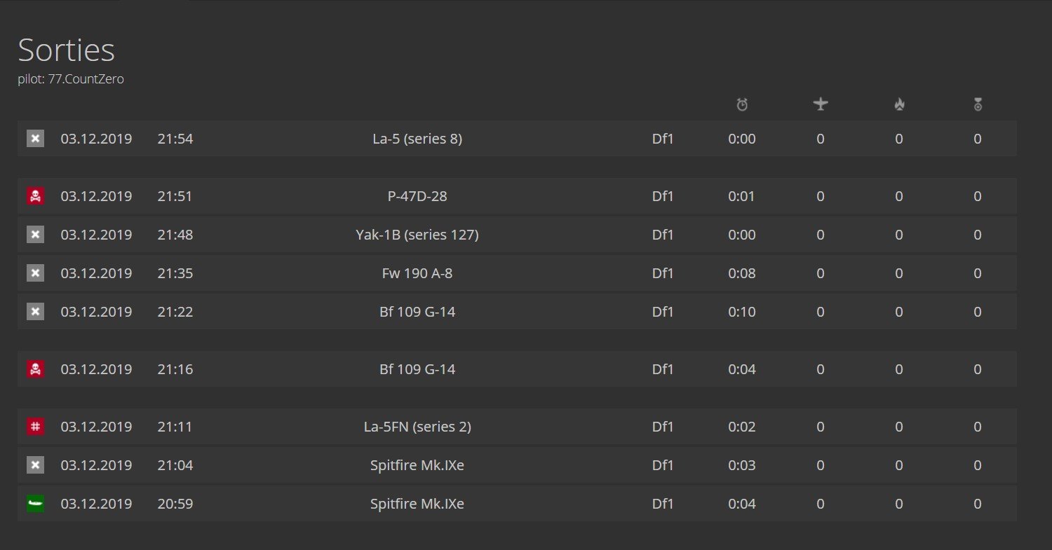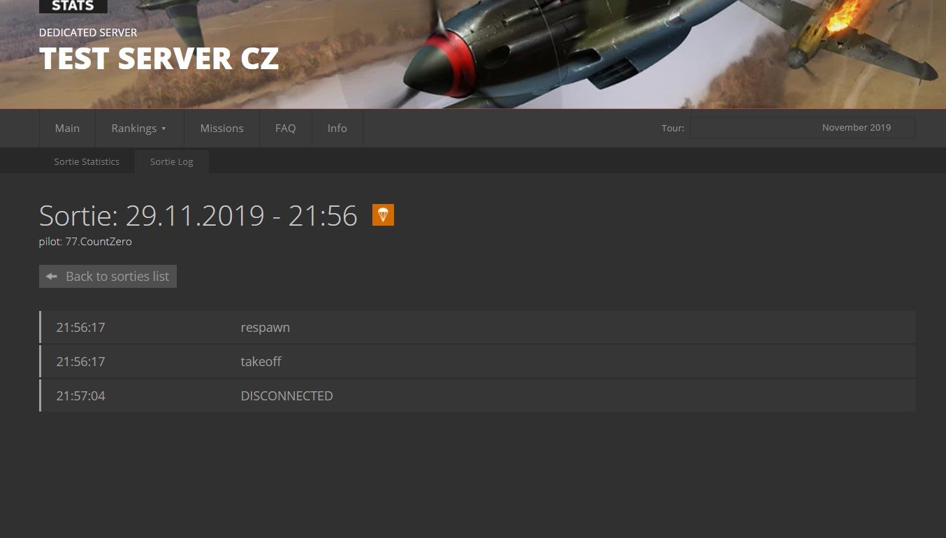 CountZero Posted December 6, 2019 Posted December 6, 2019 (edited) In original Vaal and Isay IL2 stats system any disconnection in game is considered as disco sortie, no mather if someone is at that moment shooting at you or its random disconnect. And attacker who damaged disconnecting player will not get airplane kill for him. In this mod i make this changes: 1) If player disconnected and someone damaged his airplane, player who damaged him will get that kill (like its now in game). 2a) When player disconnected, and his airplane is damaged short time before disconnection, hes sortie is considered captured sortie. Server host can set what that time can be in its "conf.ini" , with "sortie_damage_disco_time = 120" ( by default i set it to 120s, if you wont to not use this option just set it to 1). I belive this addition is neccesary because this situation has high probability of intentional disco, to avoid geting killed/captured. Now with this option player will not be able to avoid getting his virtual life to end, K/D lowered, ranks points lowered and so on... Aditionaly if for any reason you as server host need also to set at what amount of damage to airplane this option activates, you can do so in "report.py" file in "def event_player_disconnected" change "dmg_pct=0" to what ever percentage you think is fair (default is 0, so any damage abow 0% activates it). 2b) When player disconnected, and his airplane is damaged, but damaged occured long time before disconnect ( more then time server host set by "sortie_damage_disco_time" ), his sortie will just count as normal disconnection. So players who recived damage to airplane, long time ago before disconnection happend in that sortie, dont get aditionaly punished like intentional disconnecters. As probability that he did this intentionaly is not that high. 3a) If players airplane is not damaged, and disconnection happend short time after take off, disco sortie is turned into bailout sortie. This one is good if you have that any disco sortie ends players virtual life (like on WoL for example). There is big probability that player didnt disconnect intentionaly short time after take of while his not damaged and over his front, so why punish him with end of his virtual life if it can be avoided by this setting. Server host can define time for this option in servers "conf.ini" file, with "sortie_disco_min_time = 0" (by default is 0 seconds, so its not active). As doing it like in option 4 is not posible, this option 3 is best compromise. 3b) If players airplane is damaged but damage is done to it outside of time set by sortie_damaged_disco_time, and disconnection sortie lenght was inside time set by sortie_disco_min_time, then that disco sortie is turned into bailout sortie also. 4) *Not able to do from what i know, POS on disconnect is (0,0,0,0 - post if you know way to do it): Make that when player disconnected, and no damage is done to his airplane and his airplane position at time of disconnect was over frendly side, his sortie will be considered like he bailout, and if it happend over enemy side its considered as normal disco. I think this should be more fair system then how its now, and server host have options to use what he wonts how he wonts it on his server. Link for mod version 1.7.3 (its important that you dont just copy/paste whole "conf.ini" file, just make same edit to your server conf.ini file, works with original IL2 stats 1.2.71 version): https://www.mediafire.com/file/hiaeh0fznfzp1ml/discomodv1.7.3.zip/file previous version: Spoiler https://www.mediafire.com/file/0memhd7826gjqc9/discomodv1.6.1.zip/file https://www.mediafire.com/file/t4gyfbfrjbqhgaq/discomodv1.7.zip/file Edited files: -in src folder: conf.ini, config.py -in stats folder: models.py, sortie_log.py, stats_whore.py -mission_report folder: report.py For TANKS stats version: This mod works with tank stats mod, aditionaly to airplane disco changes it also changes tank sortie where player got damaged just before he exit sortie (by default is damage in 120s before player exit or disconects) or he disconected, to capture sortie, Vlife ends and attacker get kill, tank lost. If he bails out after damage, then its normal bailout sortie, attacker get kill, tank lost, Vlife dont end. So players should bail out insted just finish flight. Also damage from colisions with objects dont activate this switch. And mission crash or end also dont activate change. If damage is done outside of this 120s, sorties will just be considered as in service/normal , and no kill to player who damaged tank, no tank lost. Link for mod version 1.0 (its important that you dont just copy/paste whole "conf.ini" file, just make same edit to your server conf.ini file, works with original IL2 stats 1.2.71 version): https://www.mediafire.com/file/37qr8w36jkd4rwq/tankdiscomodv1.0.1.zip/file In original stats it looks like this: Pic1: Spoiler Pic2: Spoiler With mod i used; sortie_damage_disco_time = 60 , sortie_disco_min_time = 100 , and this is how then same sorties look: Pic 3: Spoiler Pic 4: Spoiler On pic 1 two bailout sorties (Bf-109K4 and Fw190D9) were disco in original, but as their time betwen take off and disconnection is less then 100s, they are now bailout sorties like shown on pic 3. Same happends with Yak-1b and La5 sorties on pic 2, time is shorter then 100s , so they are considered bailout , pic 4. On pic 4 you can also see that disco sorties from pic 2 are turned now in capture sorties in cases where airplane was damaged in time under 60s (2xJu87 and 1xBf110 sortie). And disco sortie on pic 2 an pic 4 for Bf109G14 counts as normal disco as last damage to airplane is done 174s before disco. Example of two sorties where damaged to airplane is done before disco, i changed sortie_damage_disco_time = 5: This sortie is normal disco as damage is done 6s before disco: Spoiler And this one is considered capture as damage is done in 5s before disco: Spoiler You can also see on both cases event "WAS SHOT