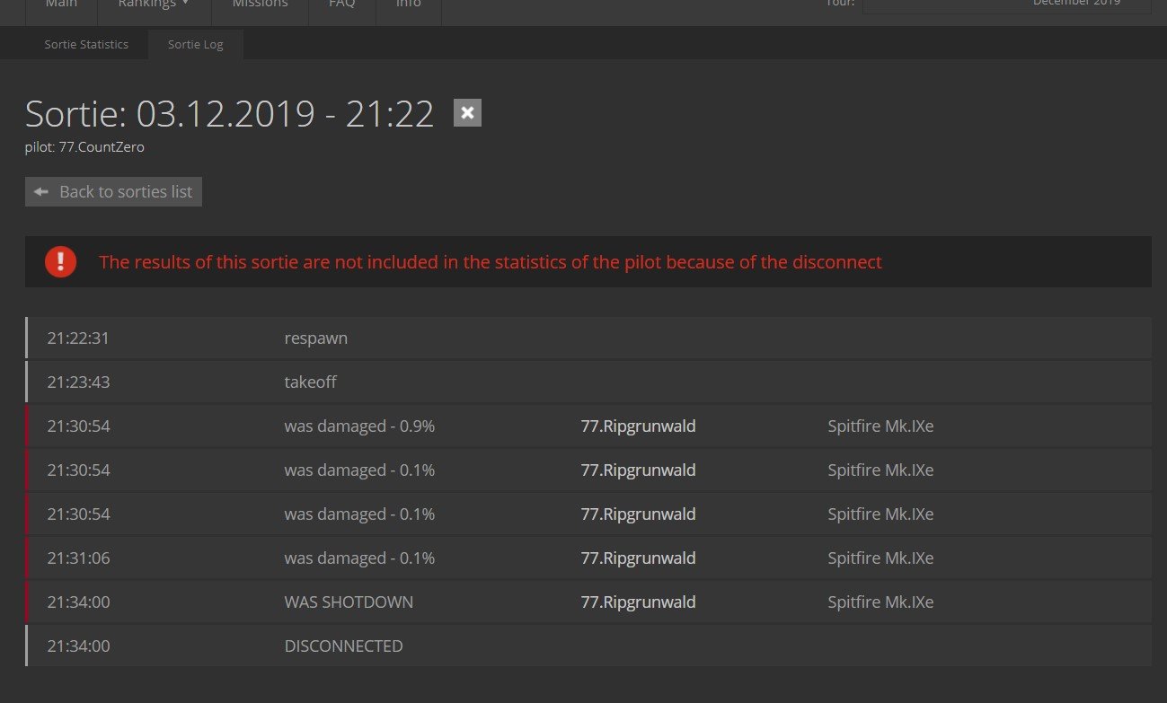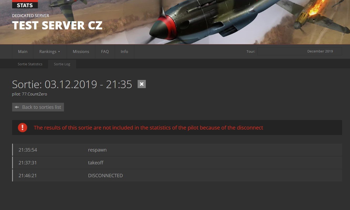 CountZero Posted January 18, 2020 Author Posted January 18, 2020 (edited) I check today missions on original stats and then compared them to stats with mod and it looks like fix works as intended so i updated first post with mod v 1.3 Post if you test it on your server and if there is any problems with it, from what i see it should work as planed from start now. EDIT: checking your server forum i see player got reported for disco when in df, and i see his sortie is turned into capture insted disco as he was damaged short before disco, and his virtual life ends and ranking points go down also. http://combatbox.net/en/sortie/log/313359/?tour=17 http://combatbox.net/en/sortie/313359/?tour=17 so it seams that edit in mod works as planed and player gets penalised automaticly Edited January 18, 2020 by CountZero