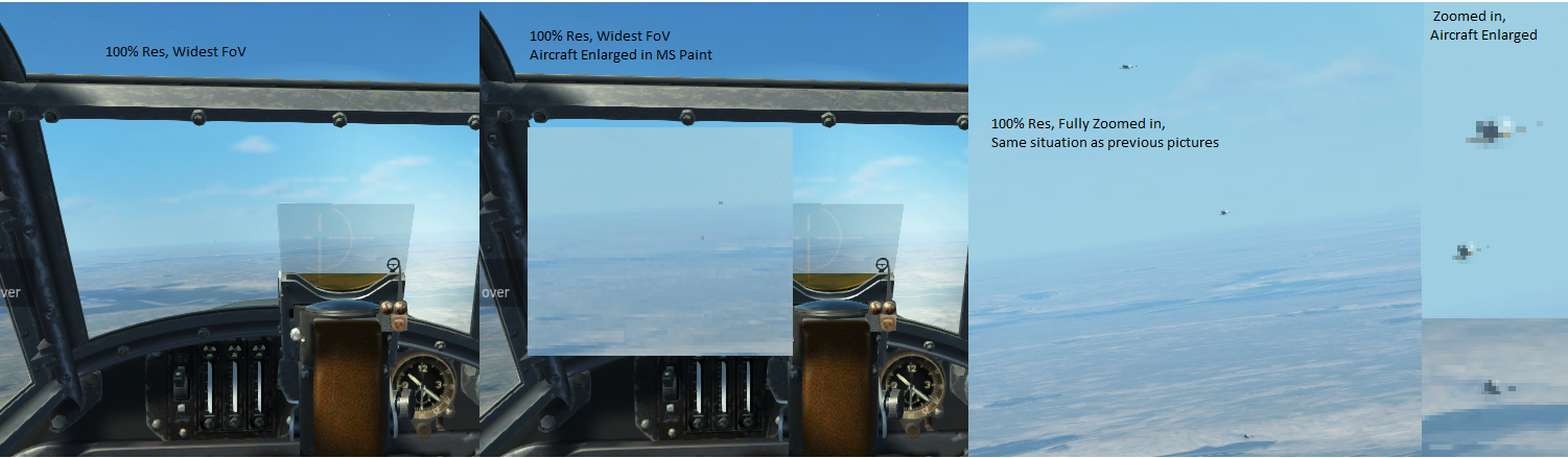 19//Moach Posted December 21, 2019 Posted December 21, 2019 (edited) I've made a picture comparison to highlight the issue: See the attachment for the image in its full resolution - I have cropped the shots, but have not rescaled graphics except where noted. Take particular notice of the images blown up in the far right -- Those are the exact same aircraft you see in the image just to the left of them. Pay attention to the amount of pixels that are completely omitted from rendering. This is not an artifact of the MS Paint enlargement process. The zoomed in image (third pic from the left) exhibits the exact same amount of invisible wings Notice also, on the first and second shots, the third (bottom) aircraft is completely invisible. It can be seen only after zooming into the area, as shown on the right. Even so, only parts of the plane are actually displayed. In a practical setting, it ends up that aircraft in dogfighting range are (from more than half up to completely) invisible around 50% of the time. It is basically impossible to maintain continuous tracking of a target farther than 500m without at resorting to predicting by guesswork or "zoom-jockeying" at various times while that airplane moves around your point of view. There is little that can be done by tweaking AA settings, even for an expert user (I am a game programmer myself, mind you, I tweak everything) that will have any significant impact on these results. The problem is inherent of the nature of pixels and cannot be effectively resolved in software without non-trivial efforts. The "LoD Model Push" workaround I mentioned in the previous page however, should provide an effective workaround with very much trivial alterations. It would require nothing done by the engineering team, it is purely an artwork related task, though it does not even require a skilled 3D artist to perform. It is a very simple (even if moderately time consuming) process of applying Push modifiers of increasing strength to each farther LoD mesh, then adjusting their push values to balloon out meshes enough to ensure that pixels are not "missed" on the resulting image in the game. Results can be easily verified with a screenshot of the game pasted onto MS Paint. Then enlarge (ctrl+mousewheel) and see how much of the plane is actually visible at any given distance. Adjust until the entire airplane is satisfactorily free of missing bits at any distance and zoom combinations. Edited December 21, 2019 by 19//Moach 3