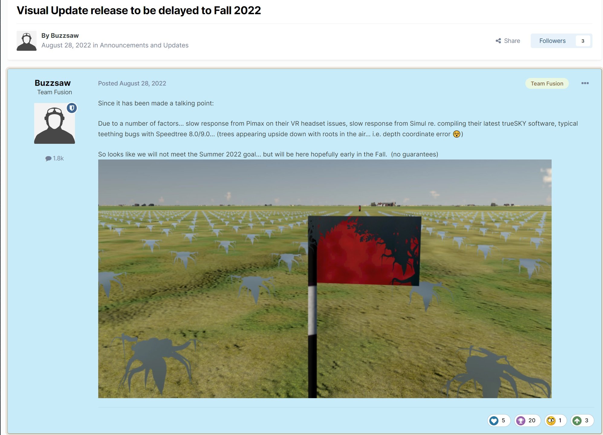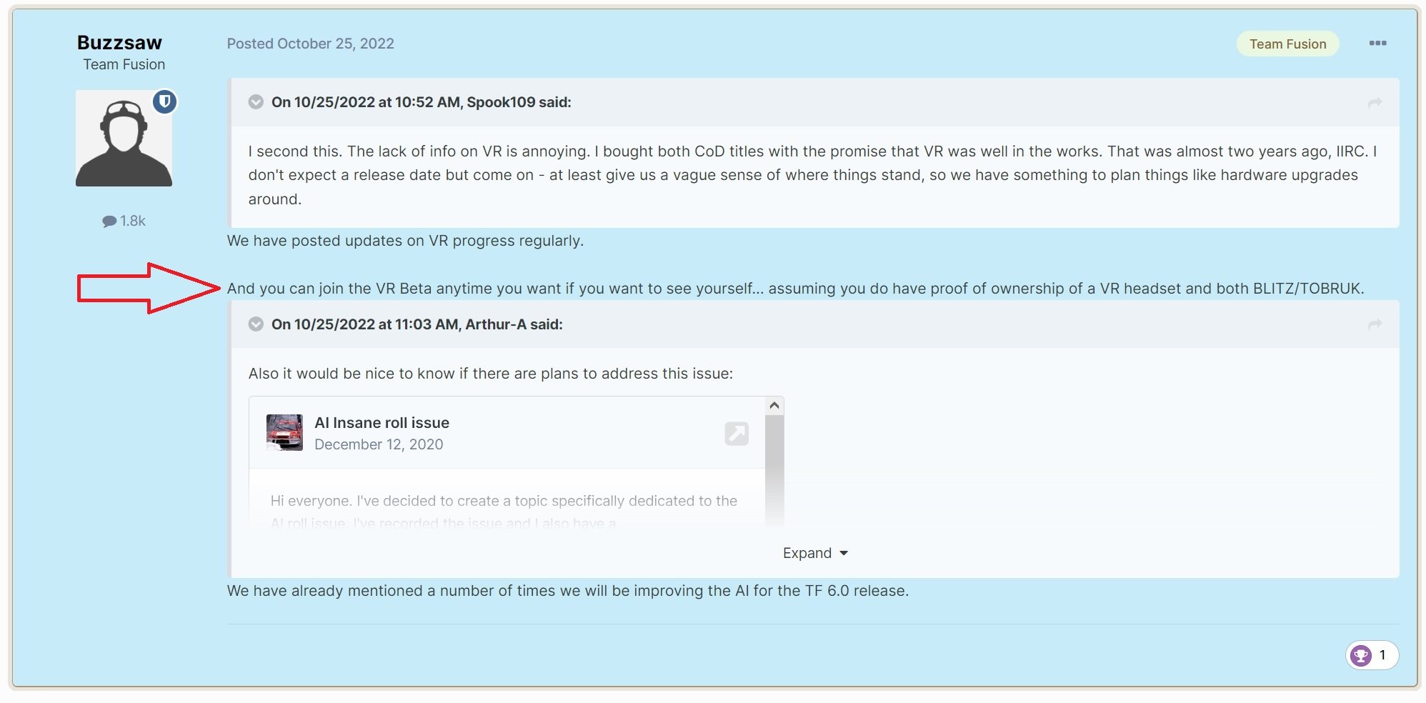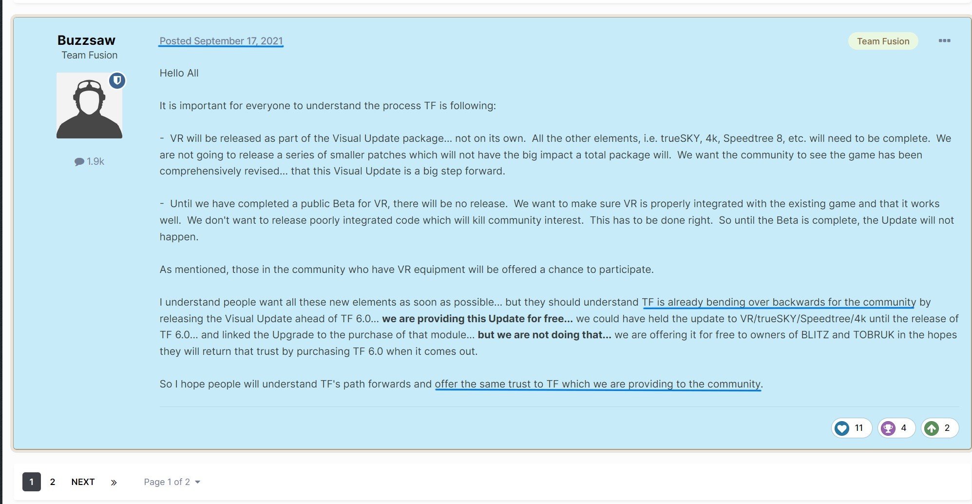 Dagwoodyt Posted January 11, 2021 Posted January 11, 2021 (edited) I think War Thunder was providing Oculus Rift support in Spring of 2016. TFS has yet to void the VR "sales success" contingency status of the August 14, 2020 development roadmap. The absence of VR support is going to generate increasing heat the longer this ambiguity persists. It is not that no one was aware that lack of VR support would be an issue. The piecemeal DW-T rollout was an explicit strategy. The quick release of the MSFS2020 VR update is a definite "uh-oh" development. The one new feature that could have been touted at rollout would have been trueSKY, yet fully six months post release we have yet to see video demo of the "alpha" stage of trueSKY implementation. Welcoming of discussion is the only way forward. Edited January 11, 2021 by Dagwoodyt 1 1