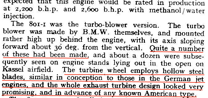 69th_chuter Posted August 17, 2014 Posted August 17, 2014 (edited) Without the IF..... The installed weight on an FW-190A2 was ~2326lbs for the BMW 801 vs ~3240lbs for the P-47D's R-2800. That makes for 1.8 pounds per Horsepower for the Focke Wulf vs 2.12lbs per Horsepower for the P-47's....just looking at the installed weight of just the engine at maximum continuous. The reason for the "IF" is you're comparing apples to oranges. The installed weight of the P-47 engine includes the weight of the turbo installation which the 190 is lacking. So, I thought it more appropriate to compare a turboed 801 to a turboed 2800, or how about non-turboed to same. How about the turboed 801TJ, it put out 1464hp at 37730ft and weighed 3036lbs* while the turboed 2800-59 put out 1550hp at 38000ft and weighed 3240lbs. And, as for the more advanced German turbos: Did you notice "The turbine wheel employs hollow steel blades, similar in conception to those in the German jet engines"? That is because they were doing their very darndest to build a steel jet engine because the factories were told they couldn't have the 55 odd pounds of nickel and other high temp metals to build their engines with, so they developed buckets of advanced cooling technology to get the exotic metal use down to about five pounds per engine. Since fundamental jet and turbo technology are one and the same, the turbos went the same direction. For all the cooling high tech, tho, the engines and turbos didn't perform any better than their original lower cooling tech, trick metal prototypes, they just didn't melt. It took the post war era to properly meld the German cooling tech with exotic metals. So then, the Germans decided to limit turbo use to concentrate their very limited metal resources on the jets. * Author Jason R. Wisniewskiv quotes 3542lbs dry, but that's everything firewall forward less prop. Edited August 17, 2014 by chuter 1